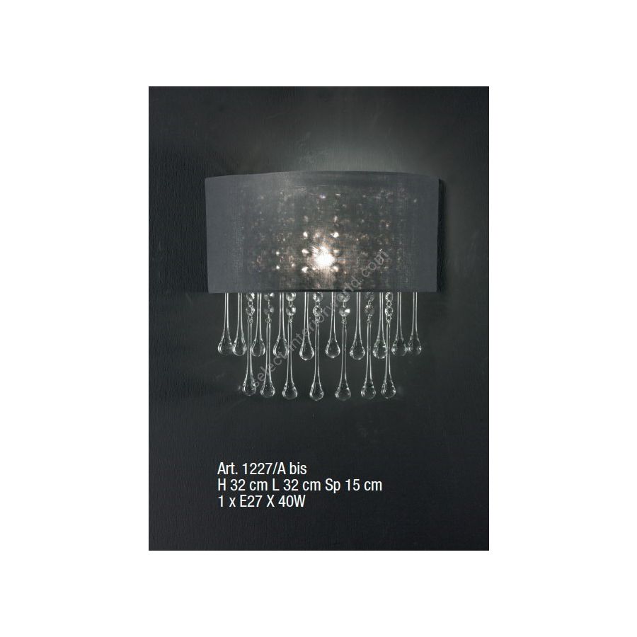 Wall lamp with black fabric lampshade and Murano Glass drops. Lighting item that diffuses the light with great effect in the surrounding environement creating a warm and welcoming atmosphere.