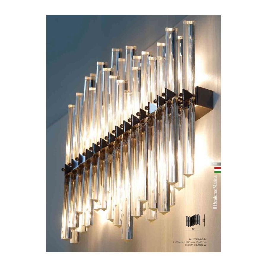 Wall sconce with transparent "triedri" glass. Lighting item that diffuses the light with great effect in the surrounding environement creating a warm and welcoming atmosphere.