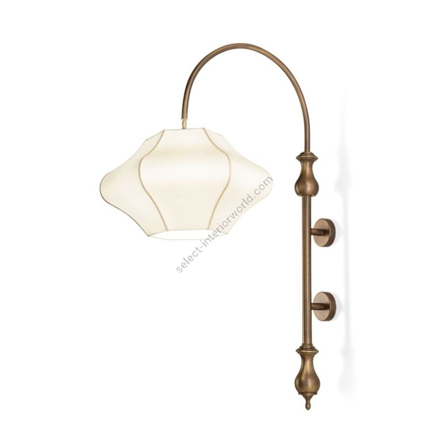 Elegant wall lamp with a hand-brushed burnished metal structure, featuring a curved arm that supports a refined lampshade in double ivory silk fabric. The light is soft and enveloping, perfect for creating a cozy and sophisticated atmosphere. Ideal for corridors, reading areas, or living spaces, it combines craftsmanship and classic-contemporary style with a touch of exclusive refinement.