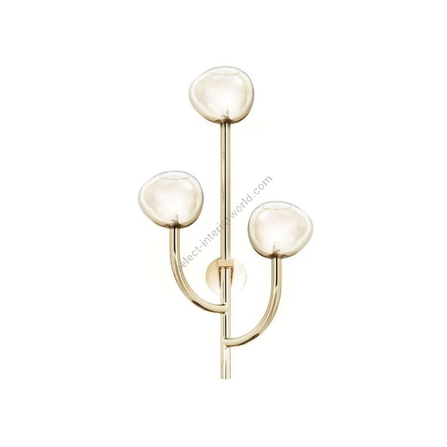 Wall Lamp in soft gold finish with honey pyrex balls. Lighting item that diffuses the light with great effect in the surrounding environement creating a warm and welcoming atmosphere.