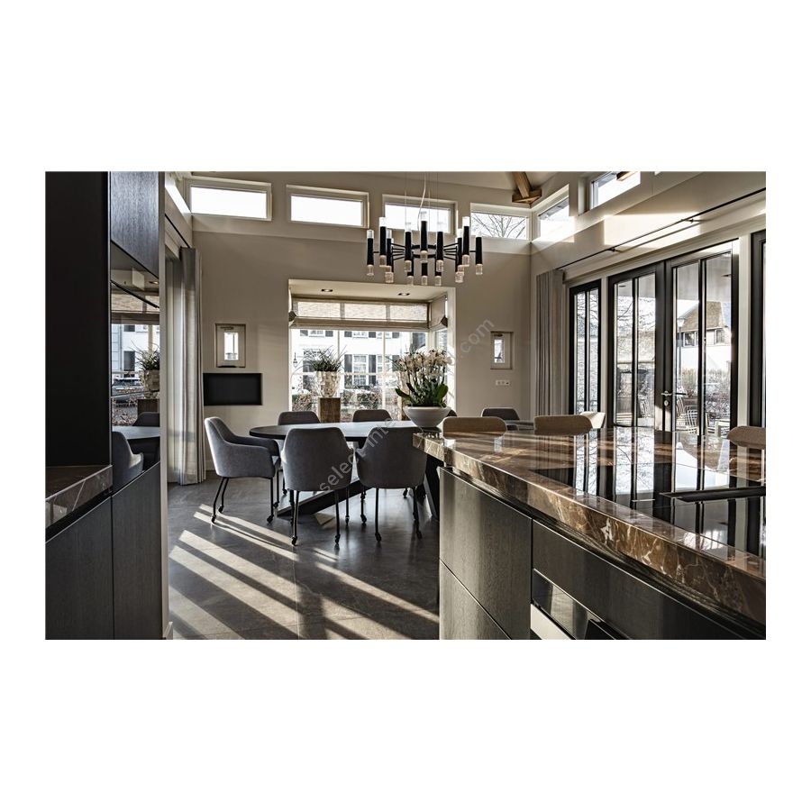 Per example, we have a beautiful elongated light fixture in our Embrace collection, which is a perfect luminary for long dining tables. This collection also includes luxurious chandeliers in a variety of sizes, all featuring beautiful, high-quality glass. The most recent addition to the collection, called Embrace Linear, provides additional options to the existent range of designs.