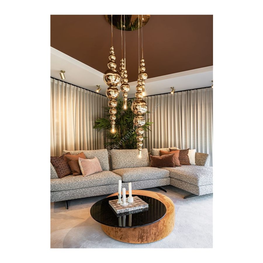 The Tears From Moon collection is able to cast away darkness, referring to the properties of lighting and the actual moon. The collection is the perfect combination of European high-quality materials and an eccentric design, handmade by specialists. Mouth-blown glass is customizable in different sizes and colours. Every colour and combination creates a different atmosphere. The glass is to be combined with refined metalwork in various finishings and either up- or downlight, or both. In addition, there are several options with details in glass, which can give the lighting an extra luxurious look.