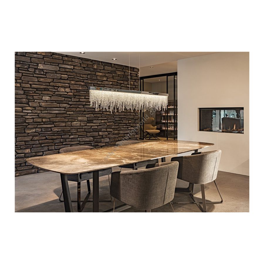 The Frozen Eyes collection brings an elegant combination of metal and crystals, which creates the associations of a waterfall. The design is best described as simple and chic. The Frozen Eyes collection is robust and eye-catching. It is a linear yet abstract design, of which the presence can illuminate a room with a beautiful shimmer. There are many possibilities regarding the Frozen Eyes collection. These include various chandelier designs, as well as wall fixtures. Each collection piece is crafted with the utmost care and precision, resulting in a beautiful finish each and every time.