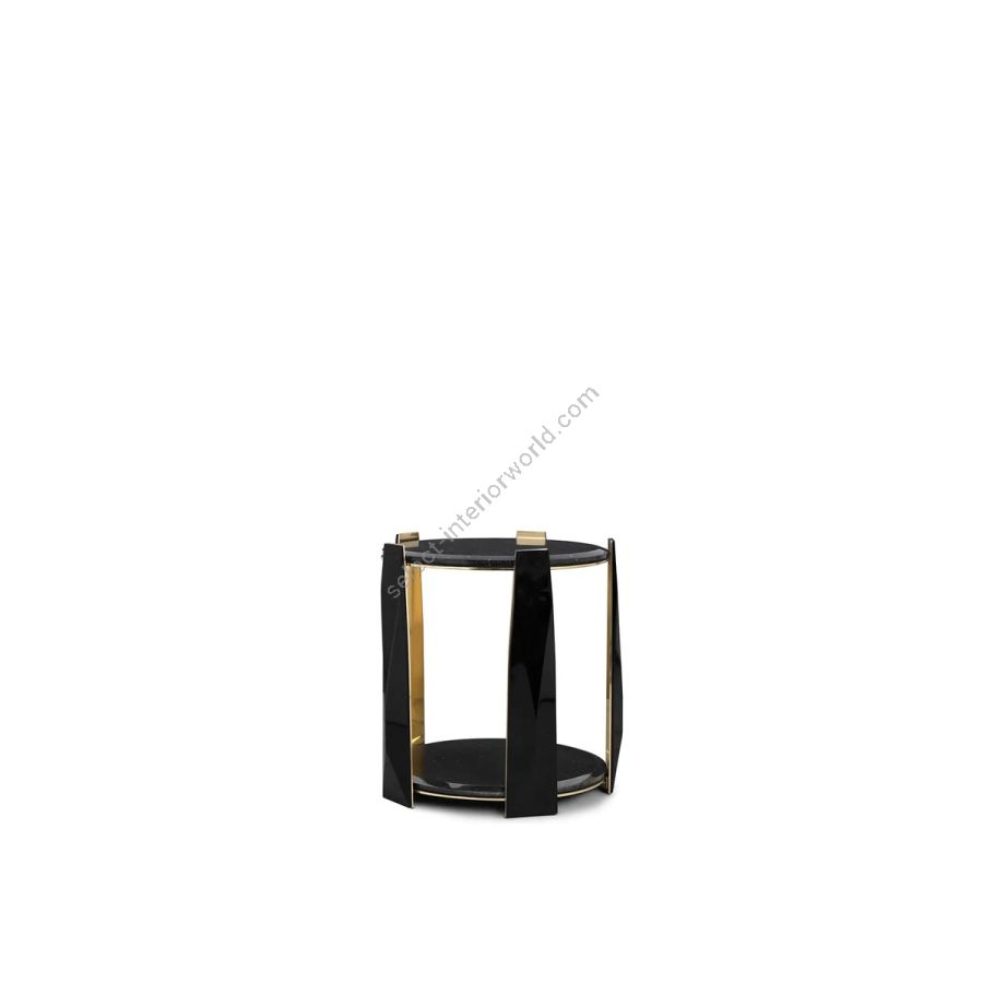 The Imperium Side Table is inspired by the grandeur of dramatic castles and majestic city walls, reminiscent of opulent crowns. Its lacquered wood structure is adorned with polished brass accents and features a Nero Marquina marble top. With its strong and commanding presence, this luxury side table exudes a sense of power, symbolizing strength and bringing a touch of greatness to any interior setting.