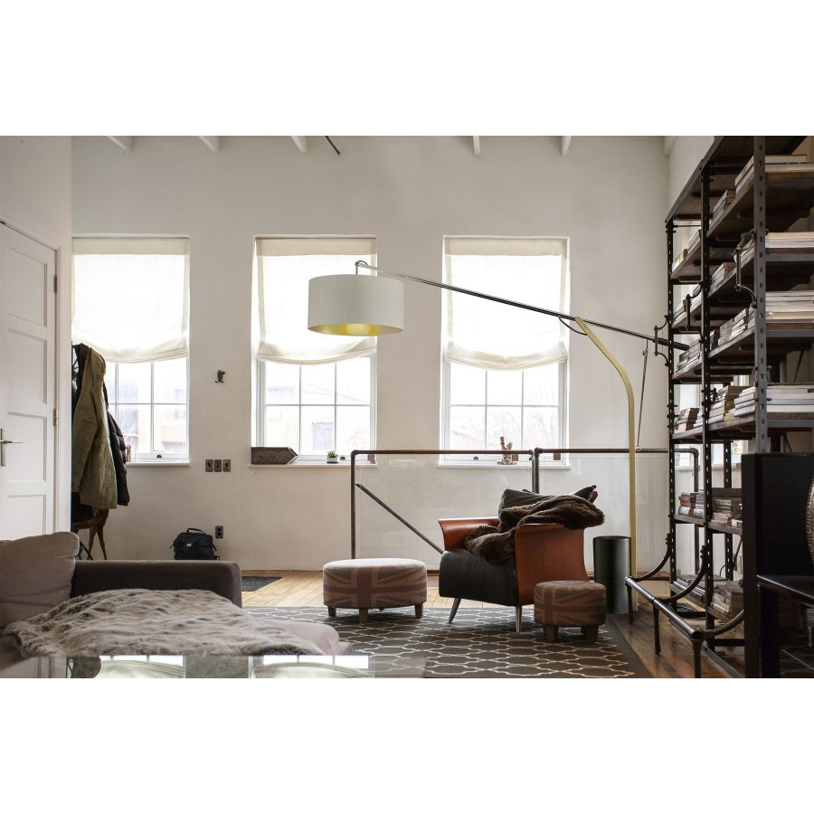 Adjustable floor lamp in metal with matt black, chrome and brushed gold finish. Ivory fabric diffuser with gold colour Inside.
