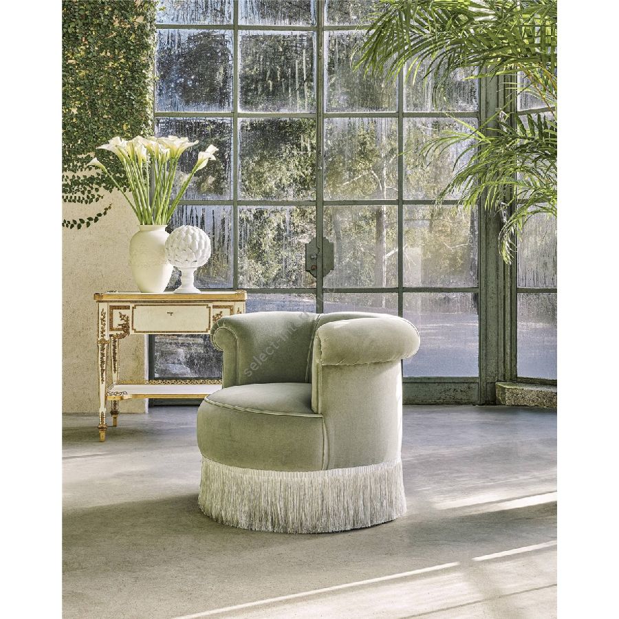 Nid is a classic-style armchair characterized by a low, enveloping backrest that invites relaxation. Upholstered in the elegant fabrics of the collection, it is enhanced by tone-on-tone piping that accentuates its refinement. The lower fringe, delicately frayed in white and grey, adds a touch of sophisticated beauty. This armchair embodies timeless elegance, perfect for adding a note of grace and distinction to any setting.
