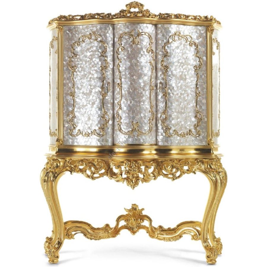 Jumbo Collection has reinterpreted this eclectic piece, the Villa Serbelloni jewel cabinet, completely realized in the furniture district of Cant by skilled craftsmen. The gold base of the original piece has been maintained, while the frame has been modified and enriched with a special mother-of-pearl pav, and adorned with decorative cast brass beveled by hand.