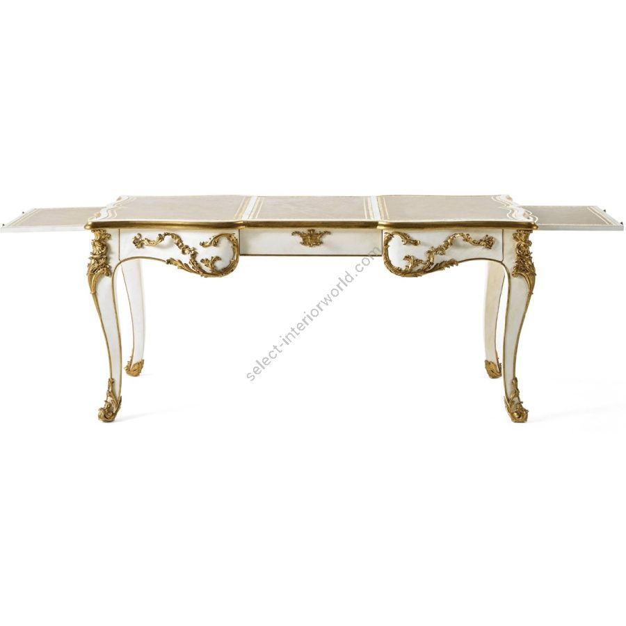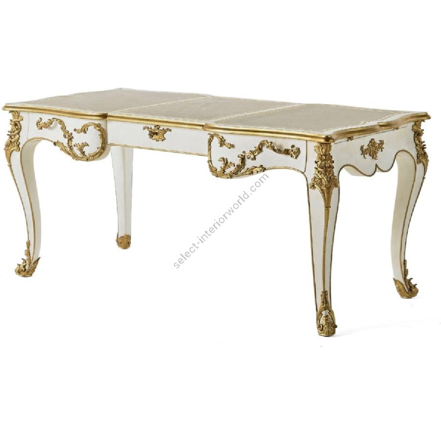 A tribute to classical tradition and the refinement of French style, the Prestige desk combines masterful craftsmanship with a reinterpretation of the codes of the past. Made of wood with a brush-applied lacquer finish and a light patina enhanced by red gold details, it is enriched by a top covered in antique leather with golden ornaments, which adds a touch of luxury and a material and enveloping feel to the touch.
