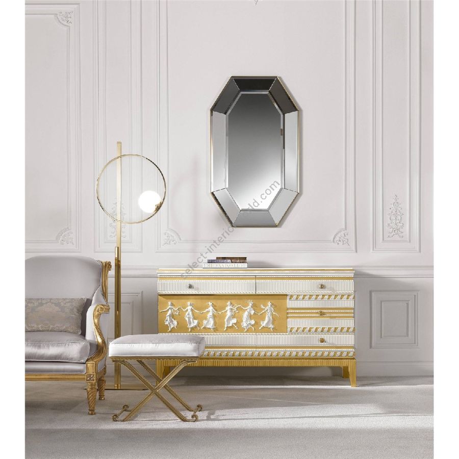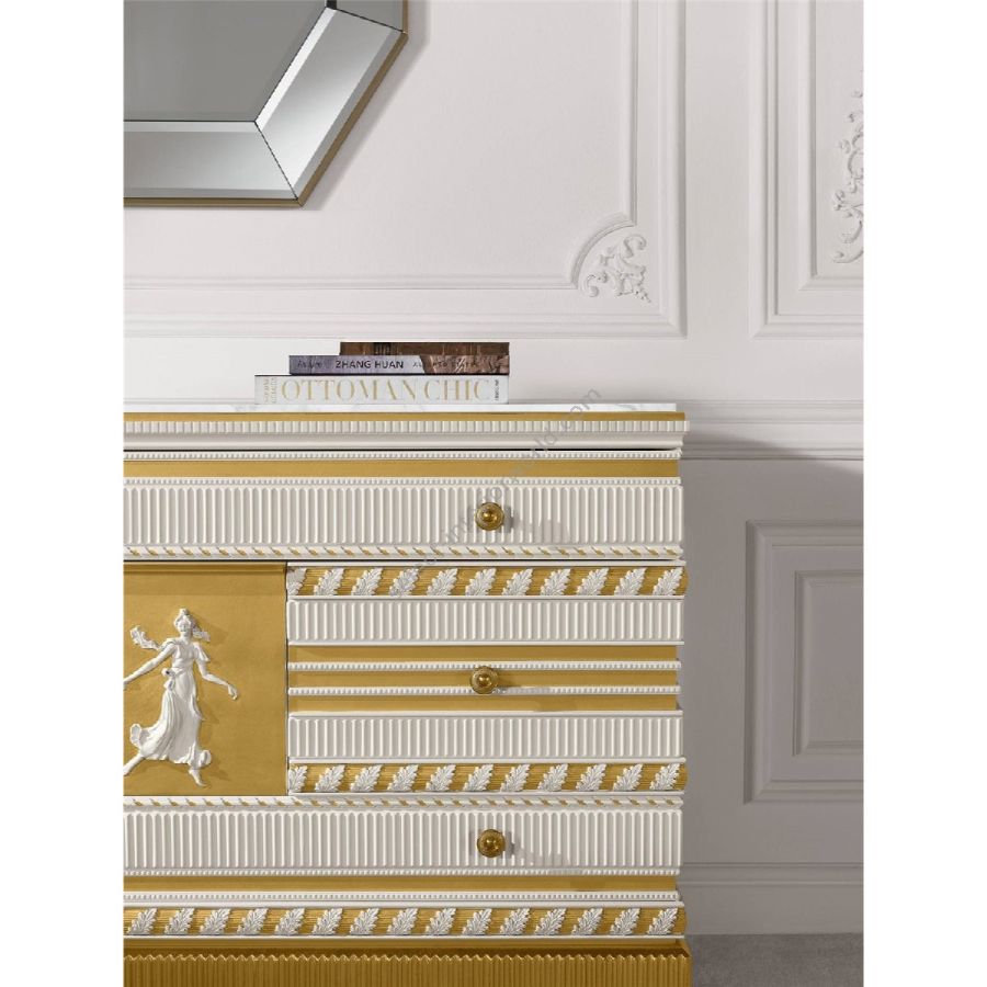 Portland is a delicate and refined line of furnishings, characterized by decorations that recall the world of Wedgwood ceramics. The ornaments with a classic charm are further enhanced by the lacquer finish with biscuit porcelain effect which lends the designs an opaque and rough effect, while the glossy opaque gold leaf gilding further enriches and enhances the pieces of the line.