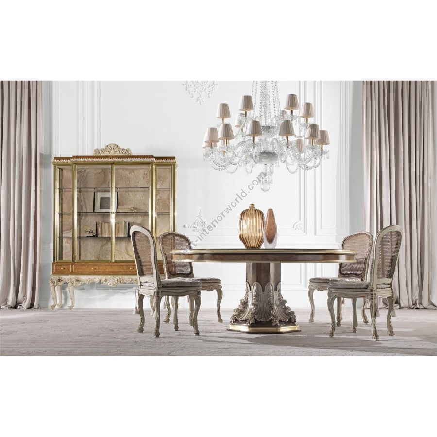 Elegant, luxurious and timeless, La Grande Dame furniture line is a tribute to the most authentic classic style. The showcases of the line are characterized by a precious hand-carved beechwood base in Louis XV style with finish in walnut and patinated white and gold. The structure is in walnut while the back is in onyx.