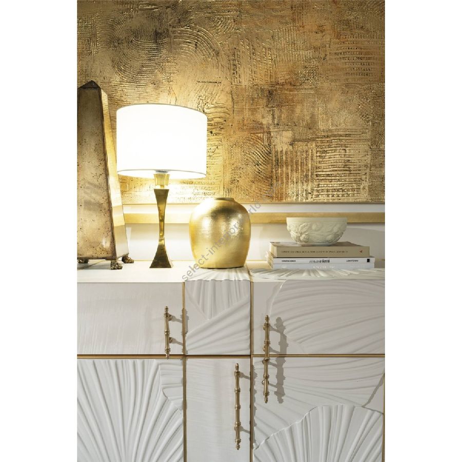 The eclectic and decorative nature of Jumbo collection finds its perfect expression in the Nnuphar sideboard. The geometric shapes typical of the Deco style, found in the linear design of the structure and in the carved gold-leaf base, are lightened by the bright colour palette. The water lilies that lend their name to the piece of furniture bloom on the external structure, adding a decorative touch of oriental inspiration. The floral ornaments, in an ivory-white finishing with a biscuit effect, are combined with cast brass bamboo-shaped handles, another exotic feature that gives the sideboard a multifaceted soul.