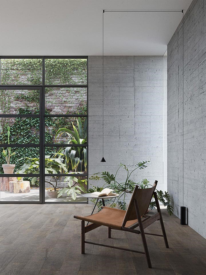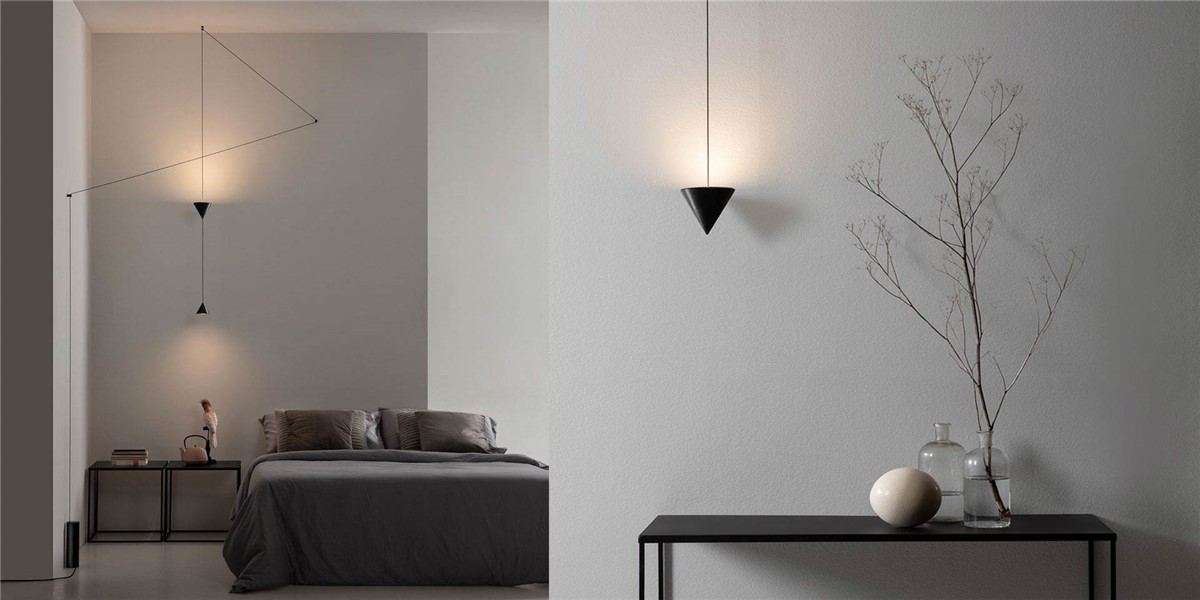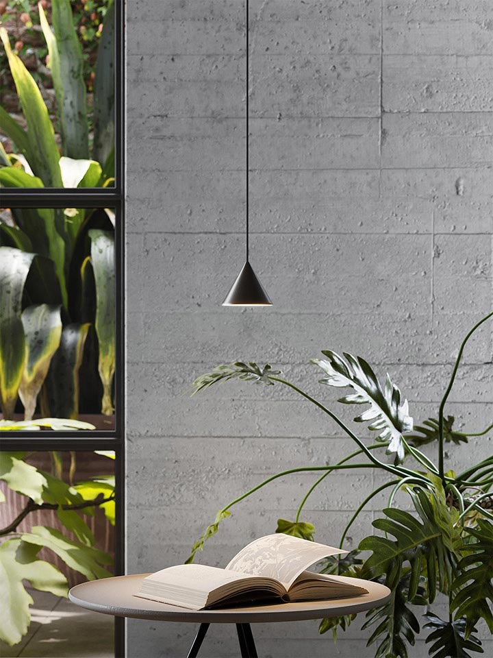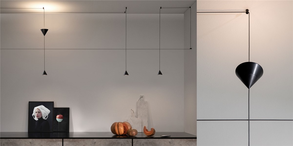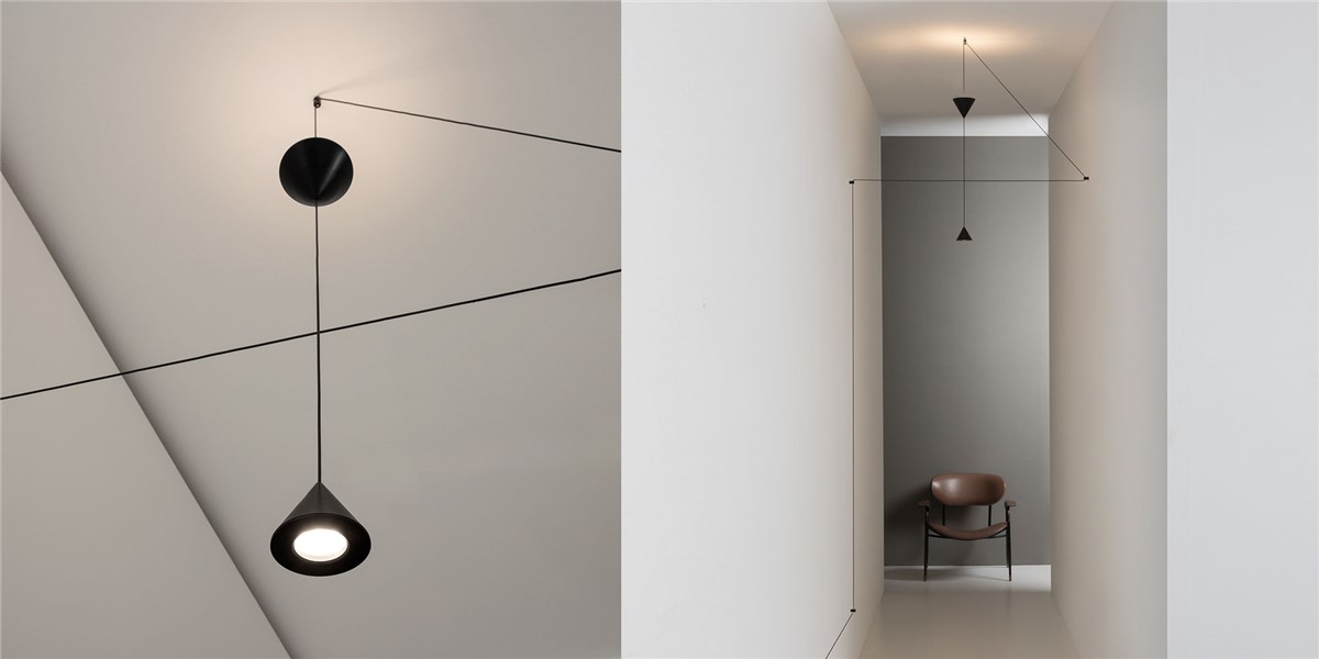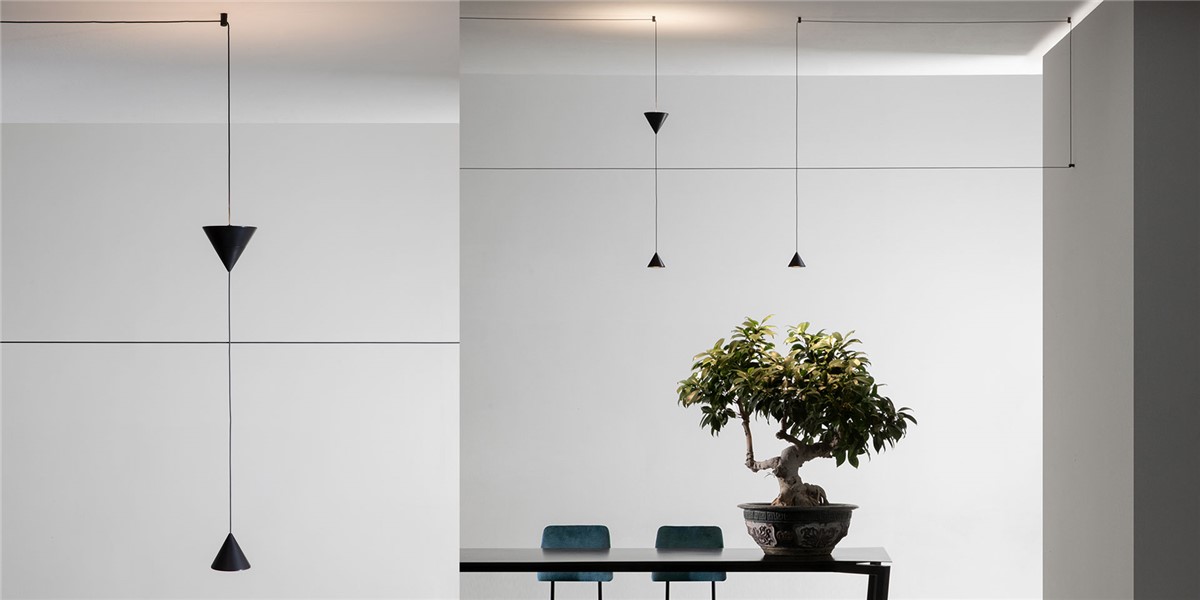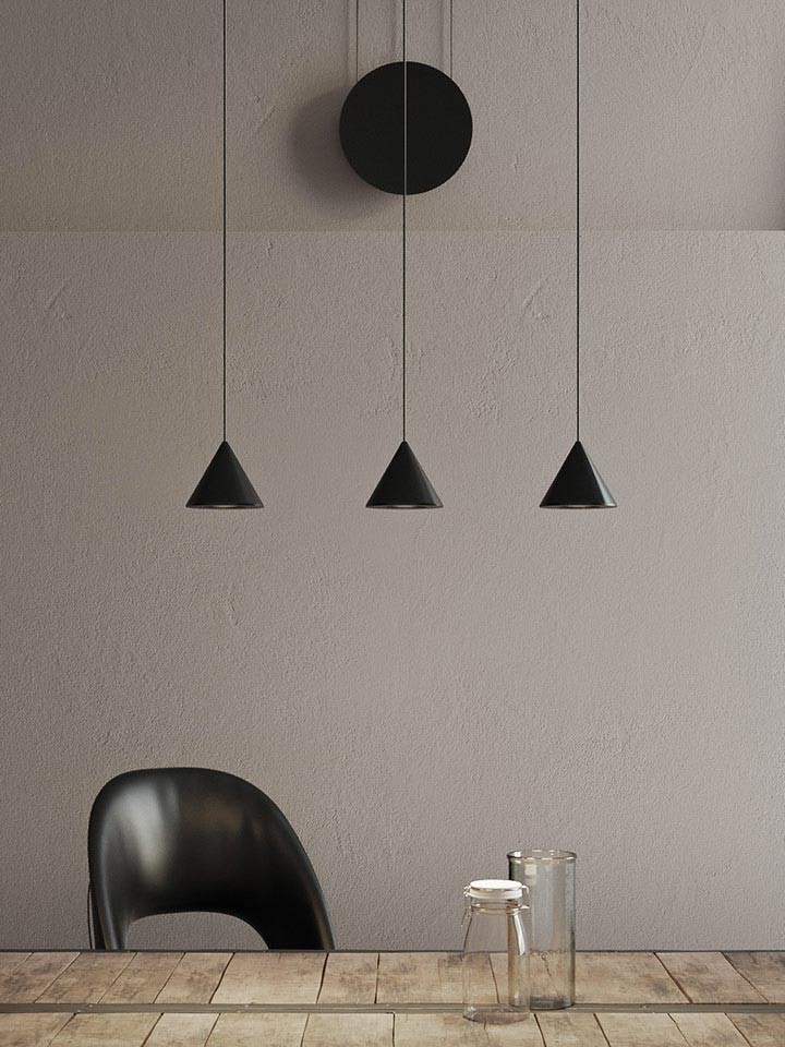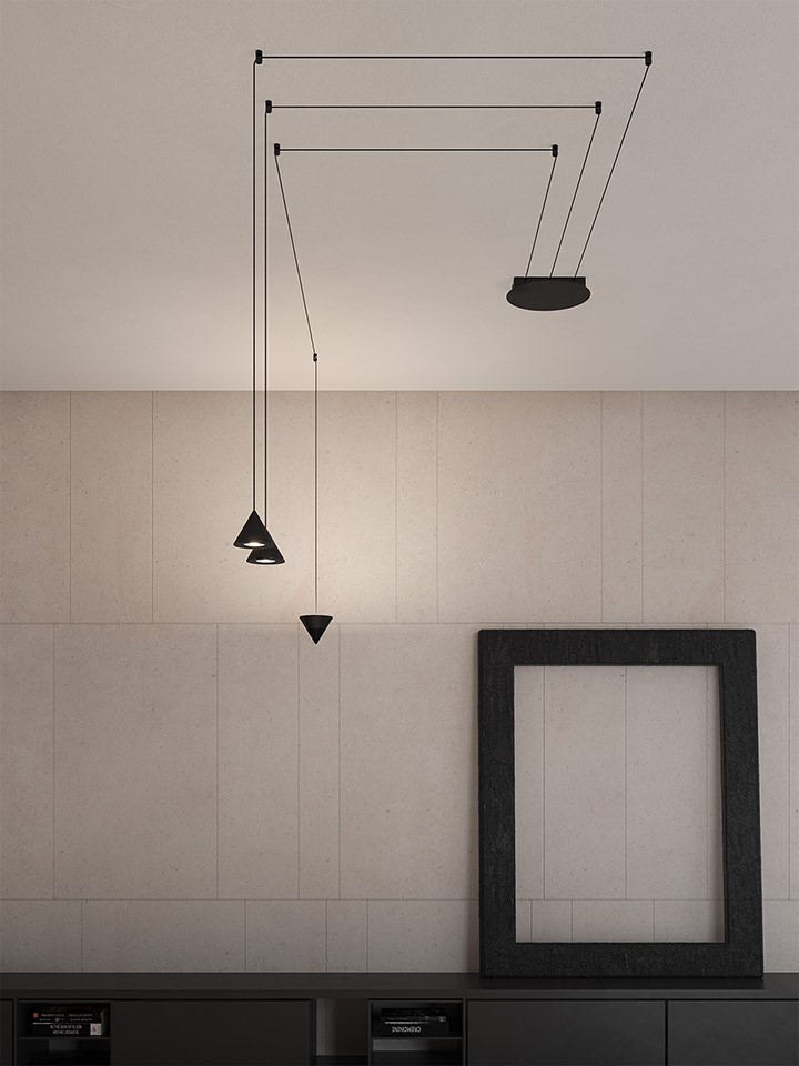 The cone diffuser is the starting point for climbing ceilings and walls, and can be suspended at various heights thanks to long thin cables that allow for different refined combinations. The cable can hold even two cone bodies that diffuse the light, one smaller with the beam pointing down and the other one, larger, pointing up, distanced as needed and attached to the ceiling or wall with special black aluminum clamp.