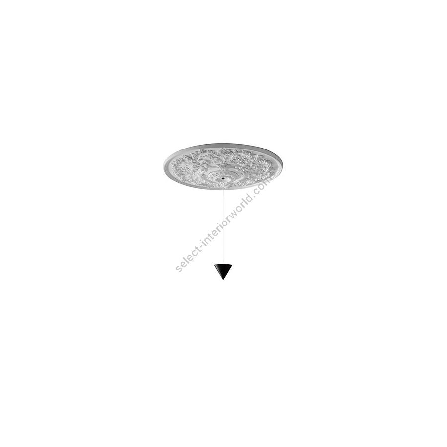 A thin black cable hangs from a large baroque rose window with a floral motif in white plaster, connected to one or two black luminum cones at the end of the cable. The combination of this element and the clasical motif of the ceiling cup makes Moonbloom a discreet architectural suspension. The rose window, available in two sizes, can be painted, immediately changing its expressiveness with a simple gesture.