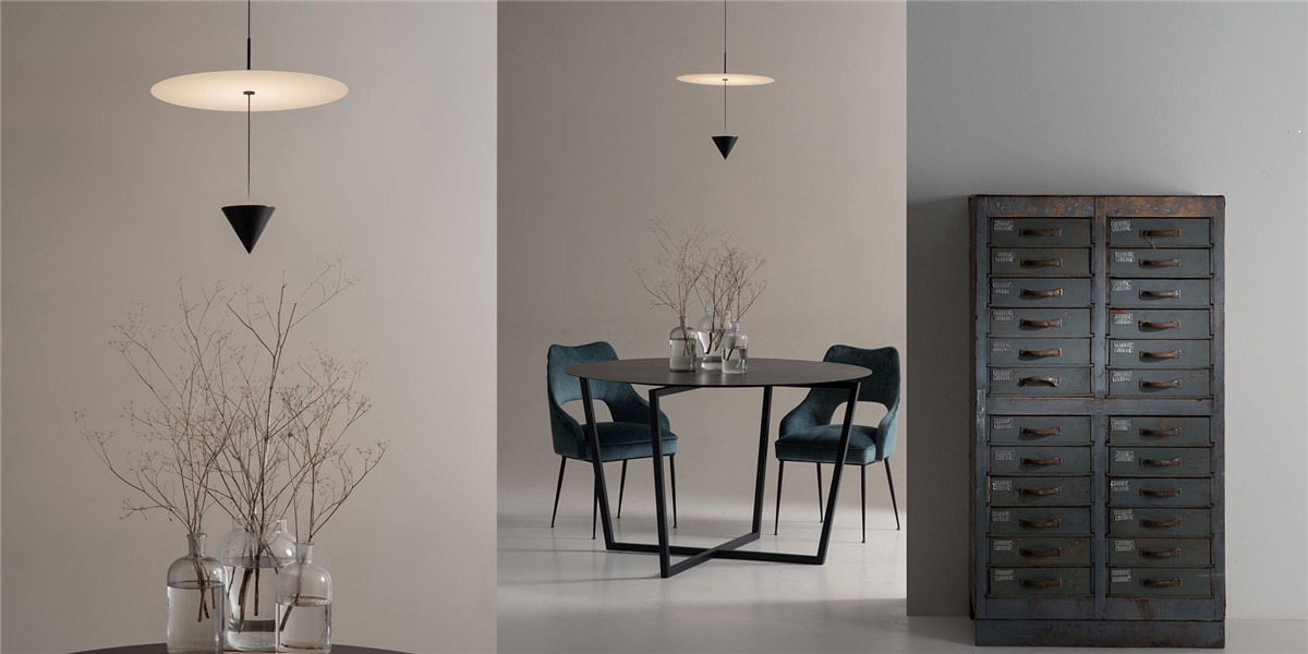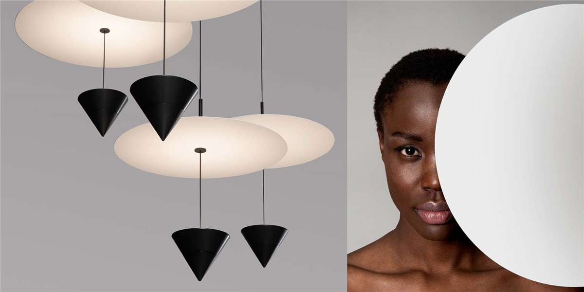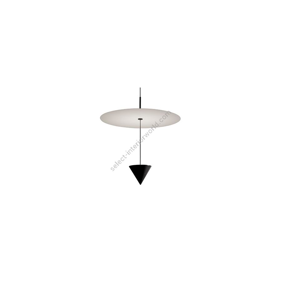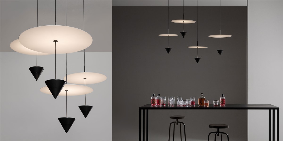 The lamp consists of a suspended circle reminescent of a full moon, two flat white aluminium discs of different diameters, where the circle of light from the inverted cone of black aluminium is perfectly reflected. The weights and anti-wheights are balanced between the geometric body of the lamp, to provide an elegant soft light from this ultra-minimal aesthetic suspension.