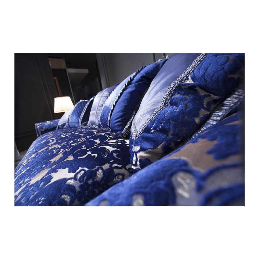 Sofa with a semiremovable seat covering. Fir wood and poplar multilayer structure. Non-deformable polyurethane foam upholstery with different densities. Reversible seat cuschions with down filling and SUPER-SOFT-SYSTEM springs. Armrest coverings, two upholstered cuschions and beechwood feet. Upon request cuschions and backrests adorned with fringed ribbon. Finish in gold or silver leaf with a choice of premium price. There is a bed version with one electro-welded standard support with H12 spring mattress.