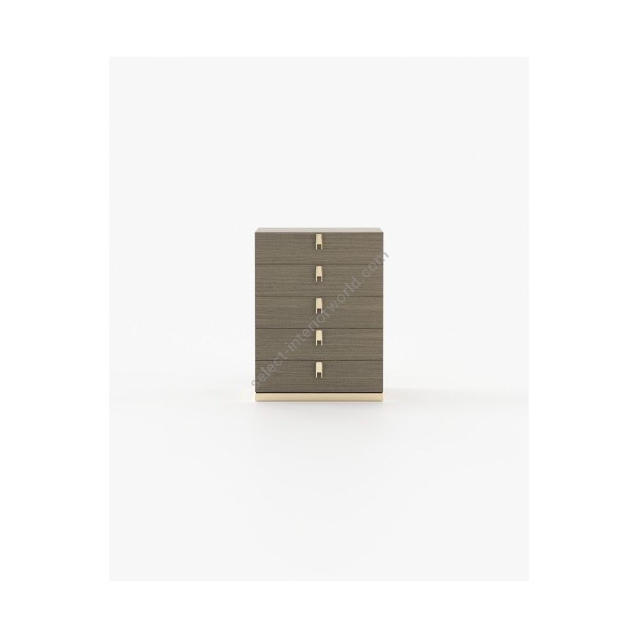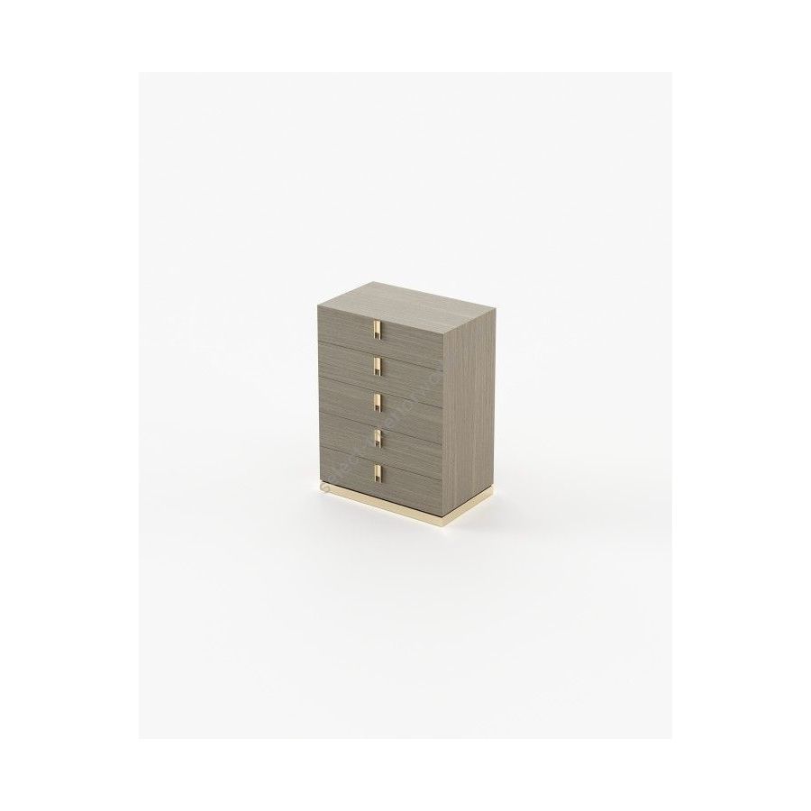 The Emily tallboy is a classic piece for functional bedrooms, featuring a wooden body and metal structure with five drawers and metal handles.