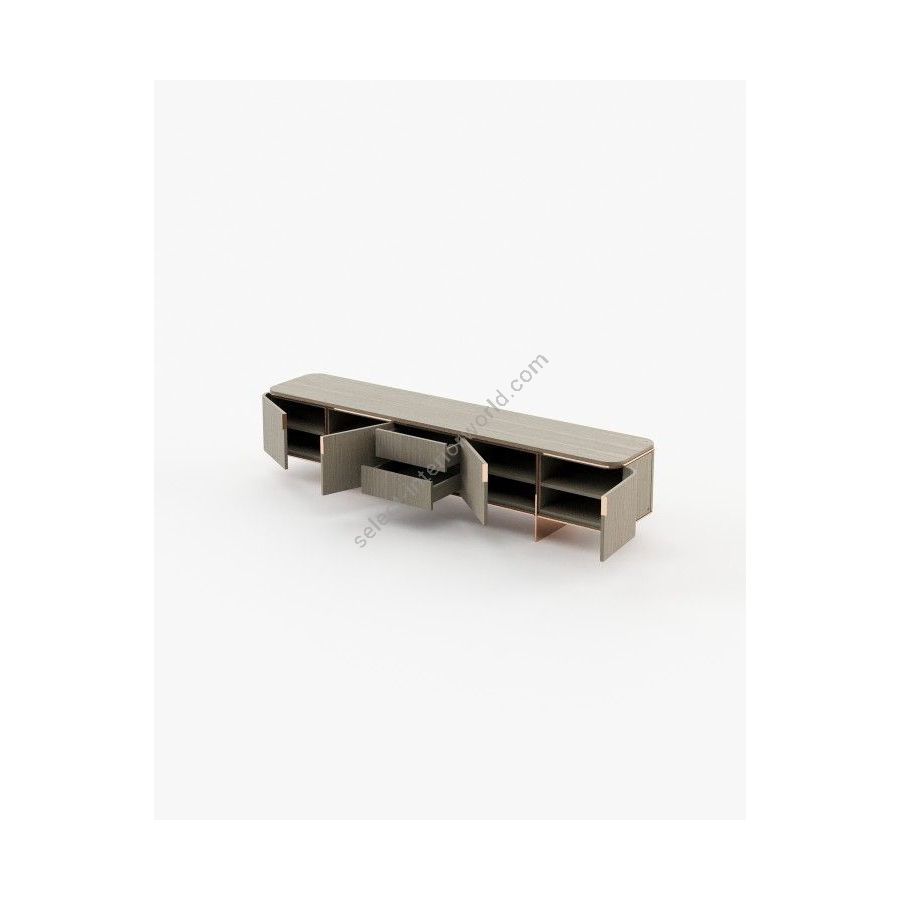 The Dean TV cabinet is a mid-century piece with charm, featuring a stunning marble top supported by a wooden structure and metallic details for a luxury touch.