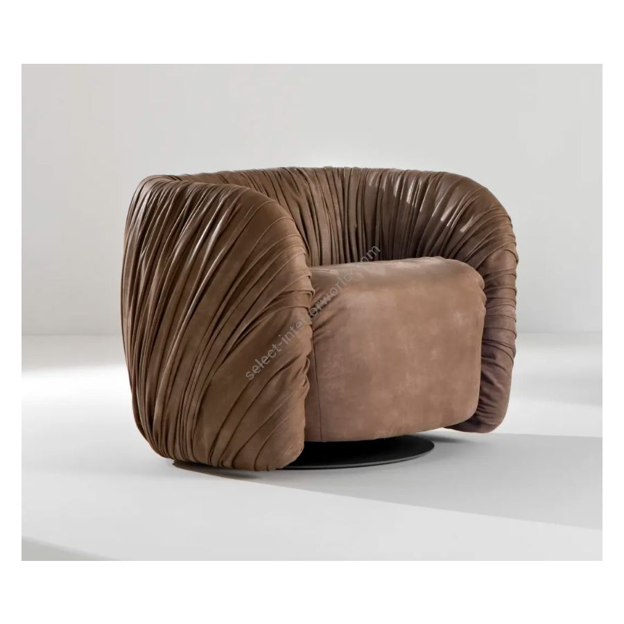 Padded swivel small armchair, covered with a soft drapery. Base in 'Mouse Grey' RAL 7005 lacquered metal.
