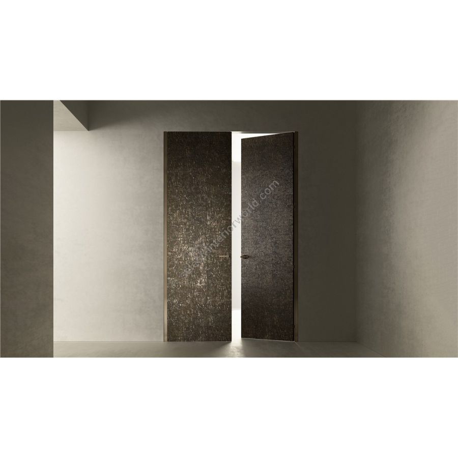 Hinged door in wood with Liquid Metal finish and Corteccia texture on the visible side.