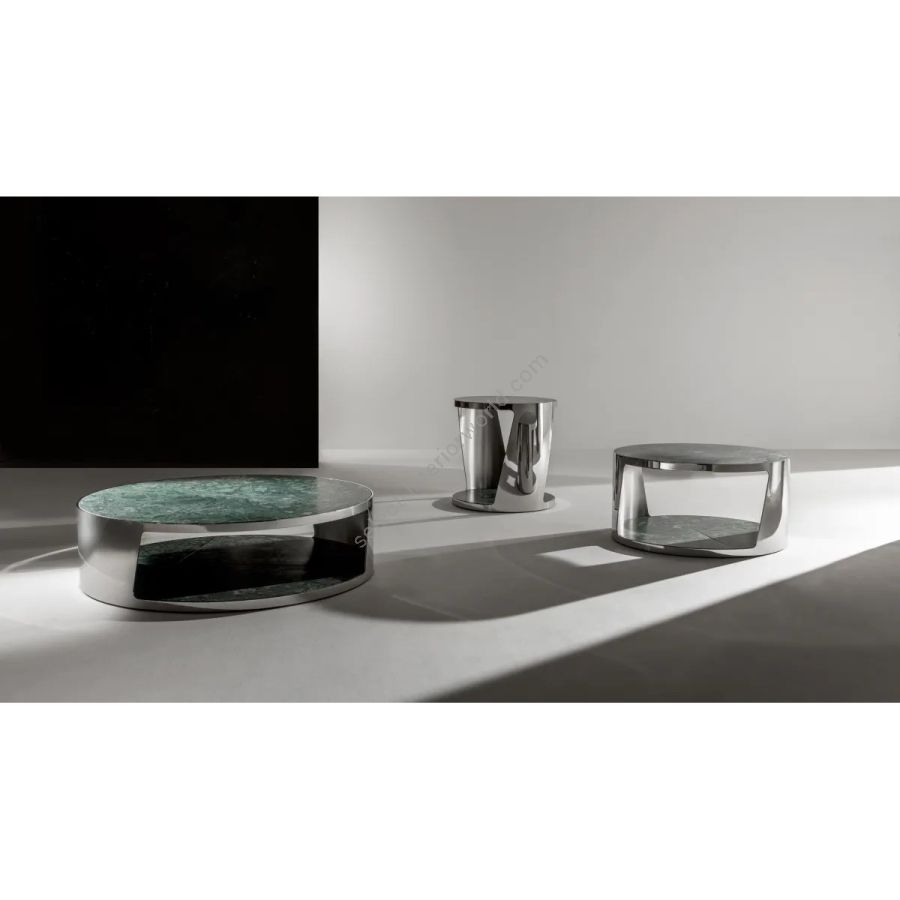 Structure available in lacquered metal, Lacca 61 and liquid velvet, and customizable tops in marble or bronzed glass.