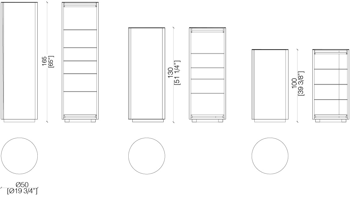 Totem with wooden structure and Lacca 61 finish in one or more colours. Top, handle and base in polished steel. Equipped with extra-light glass shelves and LED lighting.