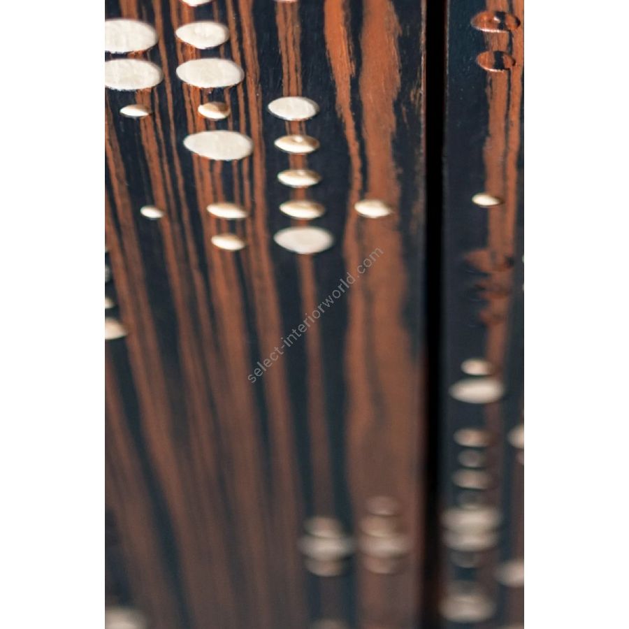 Sliding door in wood with Liquid Metal finish and Unlimited texture on the visible side, or in wood with Unlimited carving applied on overlaid essences of ebony, maple, and walnut.