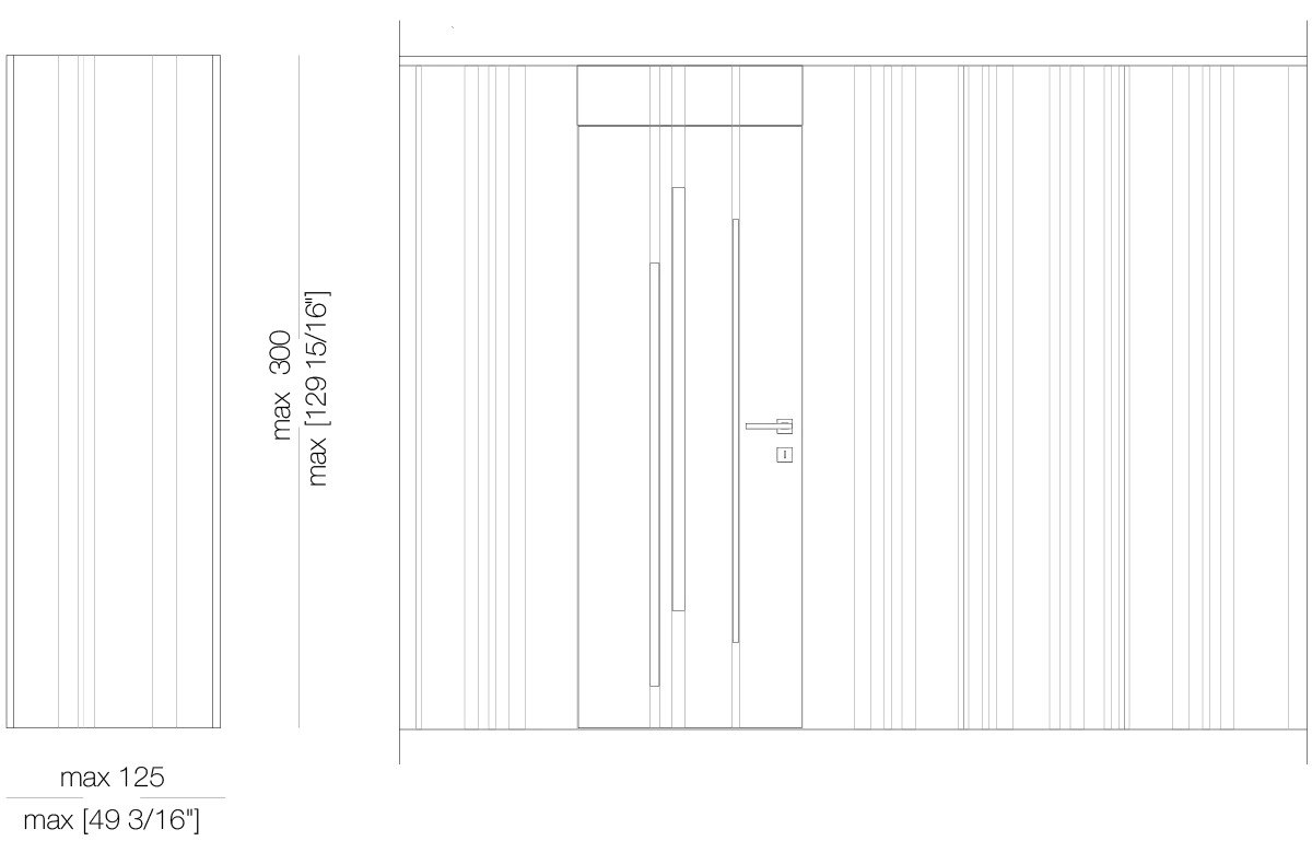 Made to measure boiserie featuring wooden panels grooved with channels of various sizes on the visible side and decorated with elliptical blocks.