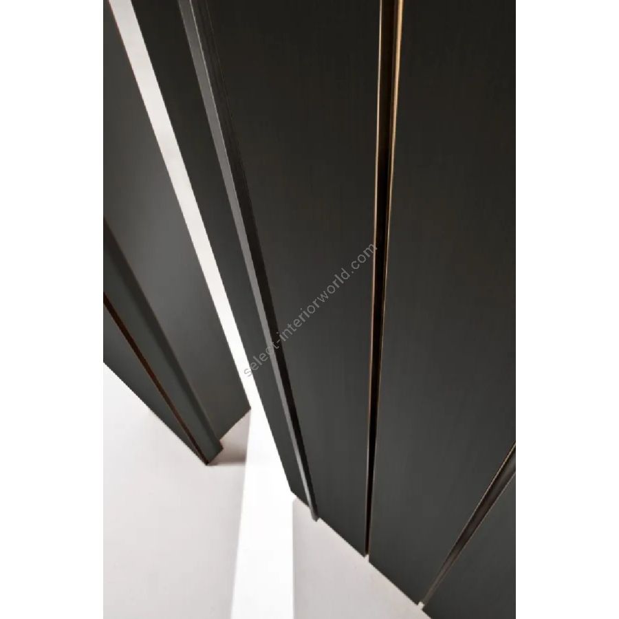Customizable in all the woods of the collection, in special wood, in dyed, brushed matt lacquered or glossy lacquered wood in all RAL/NCS colours, in Bronze Delabré and in Brown glossy ash. Also available with panels finished in mirror, marble, ceramic, leather or fabric, and in the special Garza finish.