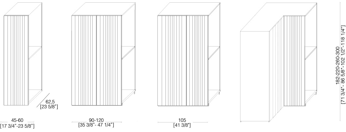 Made to measure wardrobe system clad in a sequence of metal bands, customizable in size and finishes. Available tailor-made with customizable accessories, equipment and internal finishes, and with integrated LED lighting.
