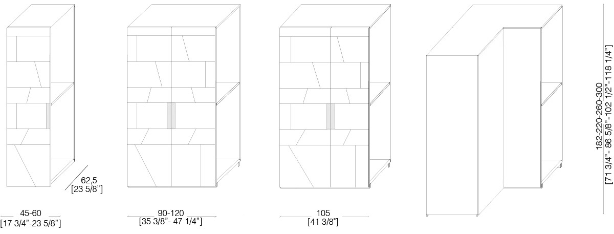 Customizable in all the essences of the collection, lacquered and aniline dyed in all RAL colours or in leather, the Terre wardrobe is available in combination with integrated wall panels and doors.