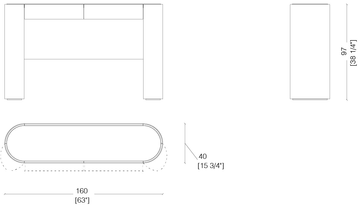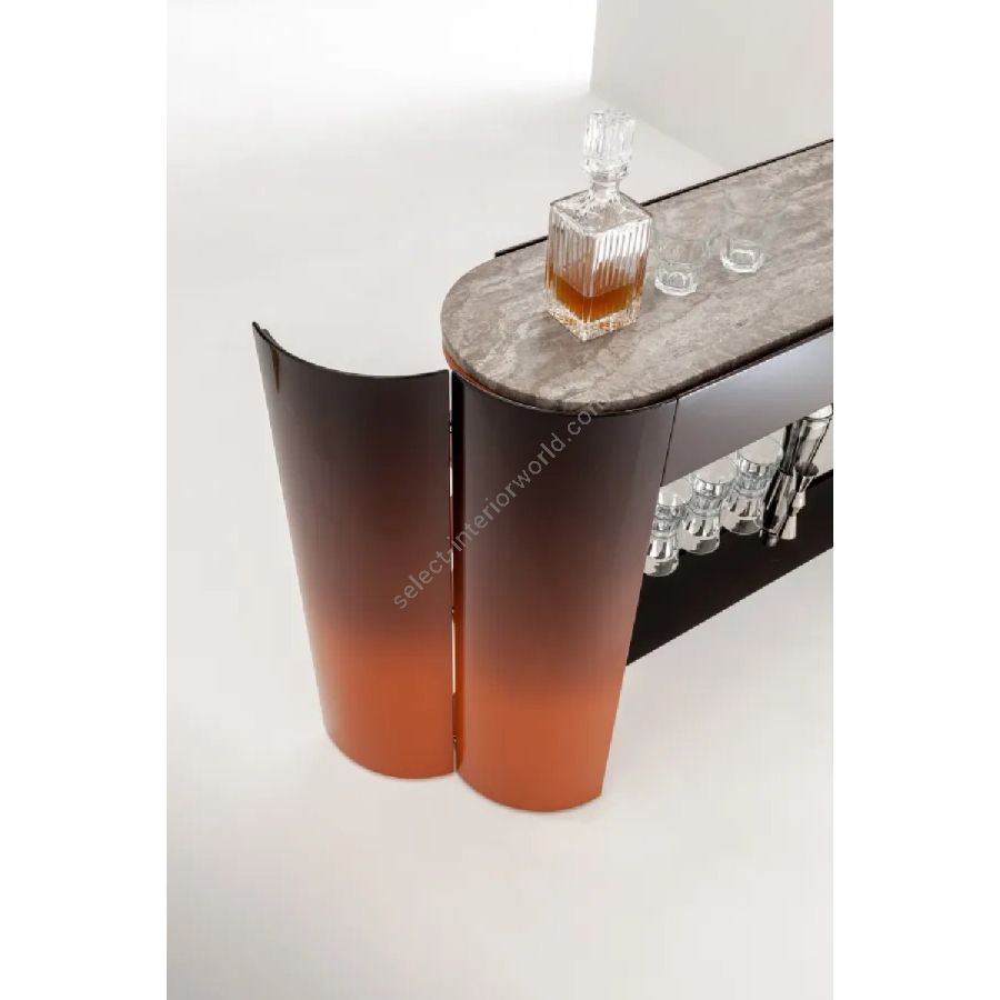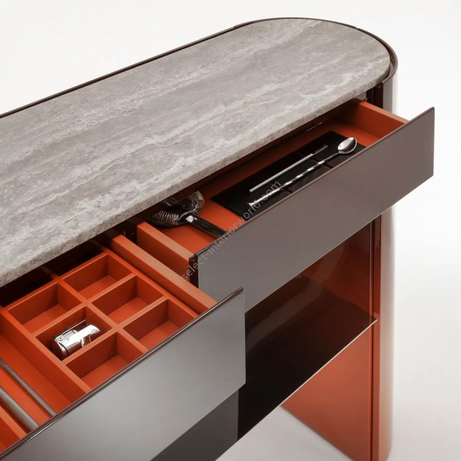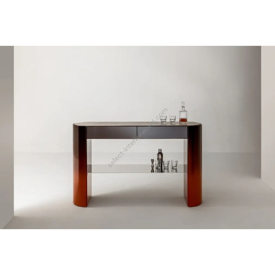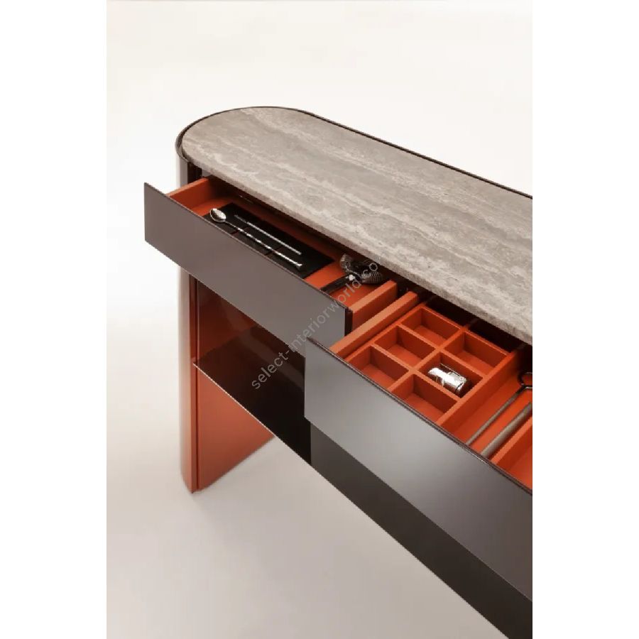 Console with curved sides, marble top, and polished steel under-top. Equipped with storage compartments with integrated hinged doors in the legs and featuring two drawers.