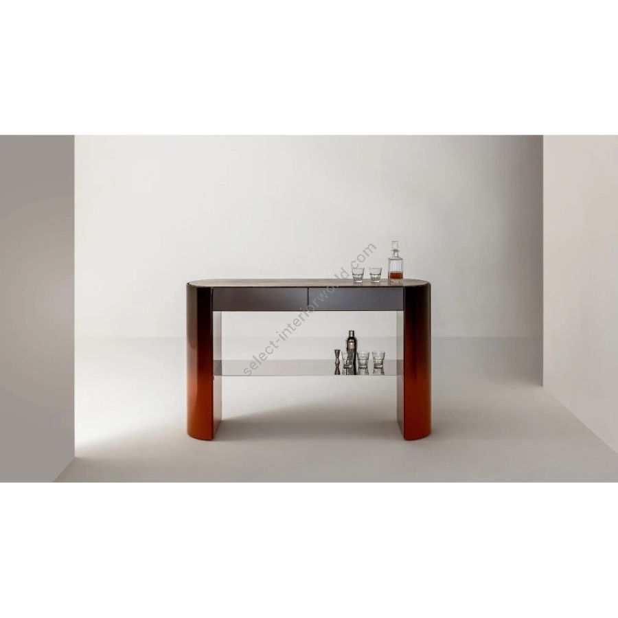 Available in plain, dyed, matte brushed lacquered, glossy lacquered, and glossy shaded lacquered wood. Customizable top in marble or wood.