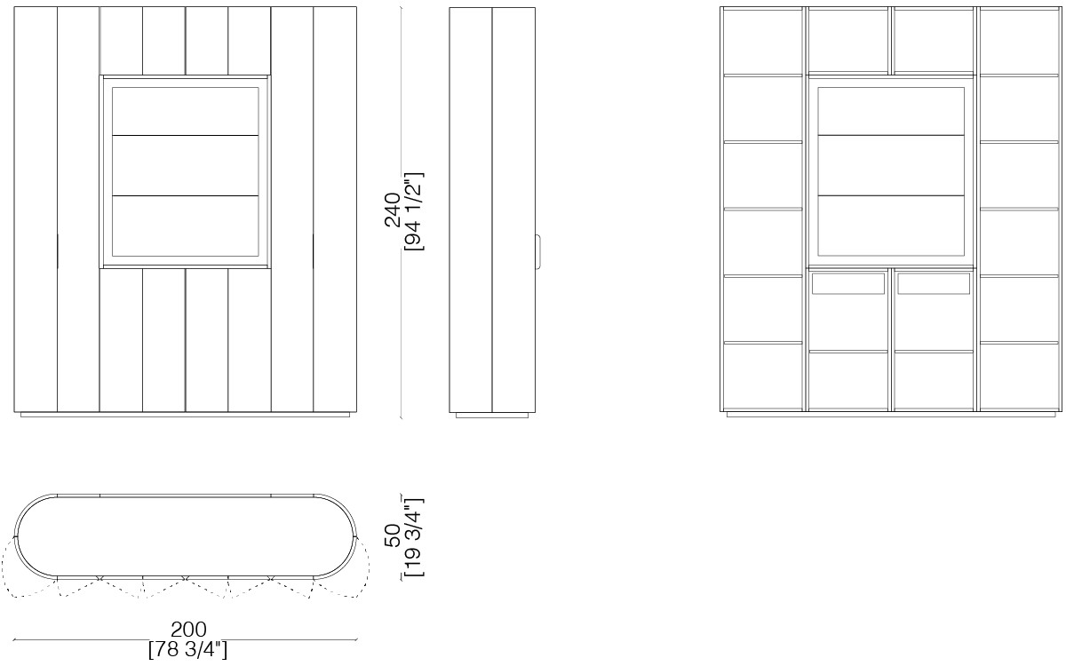 Tall storage unit with 12 hinged doors and curved sides. Wooden structure finished on all sides. Equipped with internal shelves and drawers. Open compartment lined with polished steel, featuring a mirrored back panel and glass shelves.
