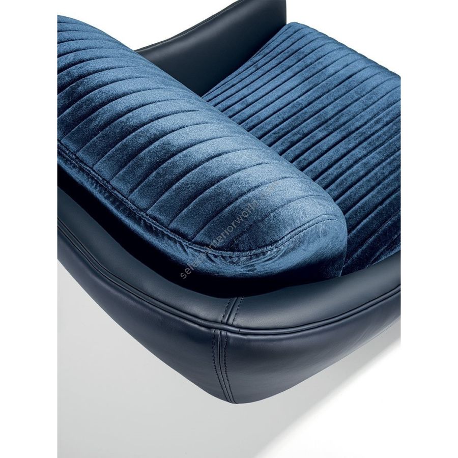 Frame in wood covered in high density polyurethane foam. Seat and backrest cushions in medium/firm polyurethane foam with ribbed quilting. Base with wood frame covered in the same upholstery as the armchair, containing a fully rotational swivel pin with self-aligning mechanism. The base is in laser cut metal in the finishes: Satin nickel, bright shaded brown, Black Rose gold, bright light gold, matt Champagne gold, bright chrome, bright black chrome, bright pink gold, matt pink gold, painted bronze. Given the particular assembly of the product, the upholstery is not removable.