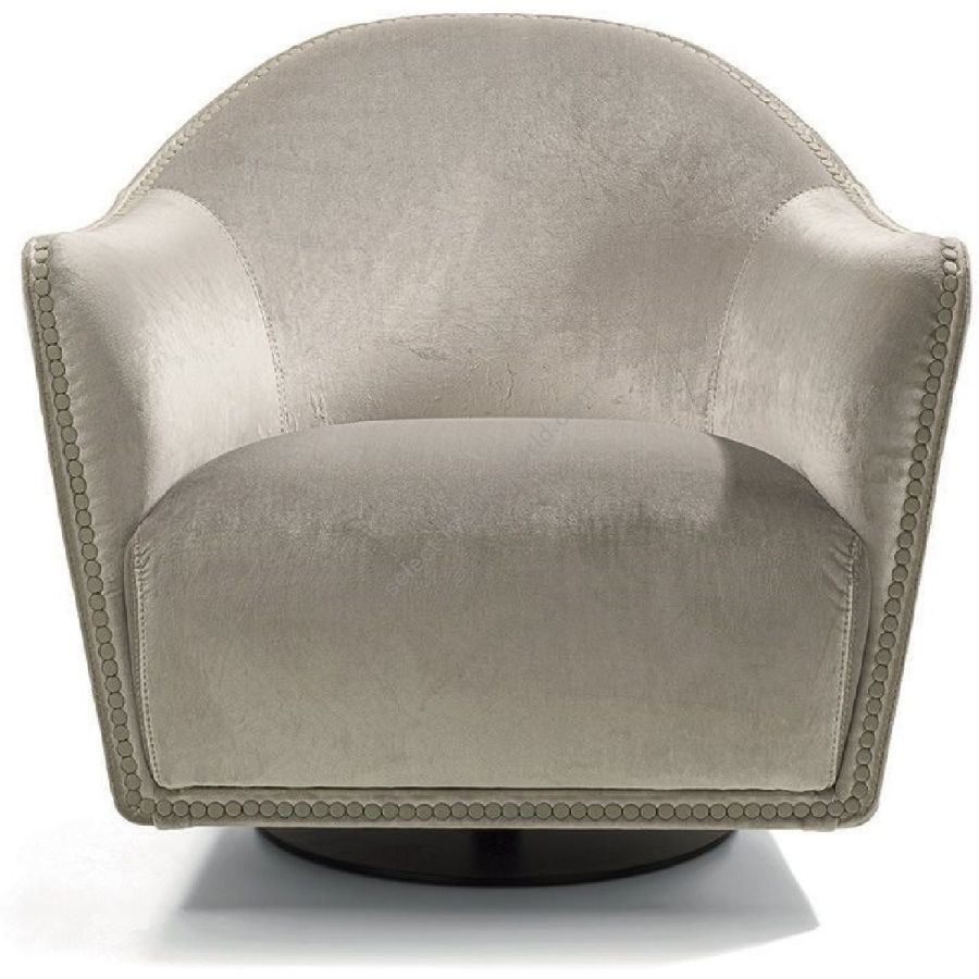 Swivel armchair (full 360° rotation) with leather or fabric upholstery, available with matching or two-tone profile or finished with visible buttons positioned manually and individually, in the finishes: bright chrome, matt black, bright light gold or matt antiqued gold, or covered in leather and, when possible, in velvet. The structure is in beech and fir plywood with high-resistance elastic bands, covered in high density polyurethane foam. The seat cushion is in multi-density polyurethane foam with rounded Memory Foam surface for better resistance to crushing over time, covered with a soft quilt of sterilised goose down. A painted bronze metal ring is placed on the base. Given the special manufacturing process, the upholstery on the seat and structure is not removable