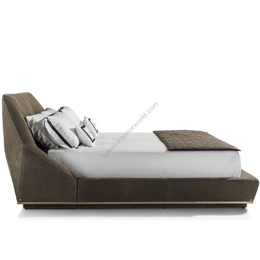 Frame in wood covered in multi-thickness polyurethane foam. The headboard and base are separated with a convenient hook fastening to make transportation and assembly easier. The bed base can hold: a fixed bedspring with wood staves. Given the particular manufacturing process, the springs height is not adjustable and this product cannot accommodate the storage compartment. Metal finishing ring on the base available in the finishes: Satin nickel, bright shaded brown, Black Rose gold, bright light gold, matt Champagne gold, bright chrome, bright black chrome, matt satin bronze, bright pink gold, matt pink gold. It is possible to have only the back of the backrest covered in velvet coordinated with the colour of the leather. Leather and fabric upholstery is not removable.