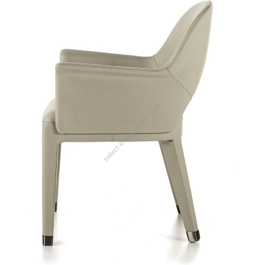 The backrest structure is in iron and cold moulded polyurethane foam. The seat base is in wood with elastic bands covered in multi-thickness polyurethane foam. The upholstery is glued to the frame and therefore non-removable. Four ferrules in bronze coloured PLA can be inserted to protect the leather that covers the bottom of the leg. They are simple to insert and remove if needed, and form the perfect base for the shape of the chair leg.