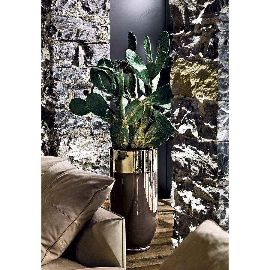 Cachepot for potted plants and flowers. Fiberglass structure covered in leather from the catalogue. Metal base and top in the finishes: Satin nickel, bright shaded brown, Black Rose gold, bright light gold, matt Champagne gold, bright chrome, bright black chrome, matt satin bronze, bright pink gold, matt pink gold.