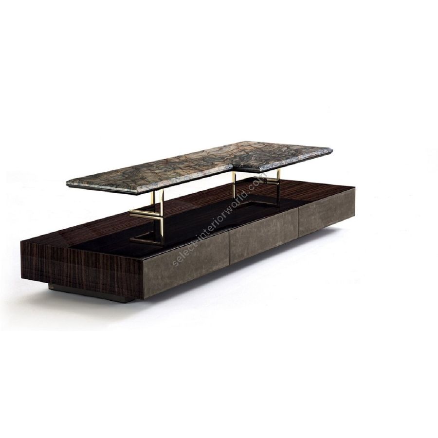 Collection of small tables in different sizes and finishes with overlapping tops at different heights toproduce a floating effect. 1 - Low table with 3 drawers with base, sides and top in wood: glossy lacquered wood in range colours, glossy ebony, glossy Canaletto walnut, glossy Maple, glossy heat-treated Eucalyptus, glossy Sycamore frisè, glossy walnut burl wood. Drawer fronts upholstered in leathers from the catalogue. Shelf in the finishes: bronze or smoky mirror with bevel, Marble with 20mm bevel: White Carrara marble, Imperial Brown marble, Sahara Noir marble (glossy and matt polyester finish), Dover White marble, Panda White marble, Guatemala Green marble, Corteccia marble, Port Saint Laurent marble, Red Levanto marble, Bardiglio Nuvolato marble, Elegant Brown marble, Shale Rosewood marble, Emperador Dark marble, Silver Wave marble, Agatha Black marble, Frappuccino marble, Calacatta marble, Fusion Light marble, Patagonia marble, Explosion Blue marble, Fusion Multicolor marble, Juliet Quartz marble, Calcite Azul marble, Azul Macauba marble. 2 - Square and rectangular small table with supports and profiles on the lower shelf in ground metal inthe finishes: Satin nickel, bright shaded brown, bright light gold, matt Champagne gold, bright chrome,bright black chrome, matt satin bronze, bright pink gold, matt pink gold, Black Rose gold. The lower shelfis in wood: glossy lacquered wood in range colours, glossy ebony, glossy Canaletto walnut, glossy Maple, glossy heat-treated Eucalyptus, glossy Sycamore frisè, glossy walnut burl wood or in Cat. P.18 leather with special stain-proofing treatment. Shelf in the finishes: bronze or smoky mirror with bevel, Marble with 20mm bevel: White Carrara marble, Imperial Brown marble, Sahara Noir marble (glossy and matt polyester finish),Dover White marble, Panda White marble, Guatemala Green marble, Corteccia marble, Port Saint Laurent marble, Red Levanto marble, Bardiglio Nuvolato marble, Elegant Brown marble, Shale Rosewood marble, Emperador Dark marble, Silver Wave marble, Agatha Black marble, Frappuccino marble, Calacatta marble,Fusion Light marble, Patagonia marble, Explosion Blue marble, Fusion Multicolor marble, Juliet Quartz marble, Calcite Azul marble, Azul Macauba marble.