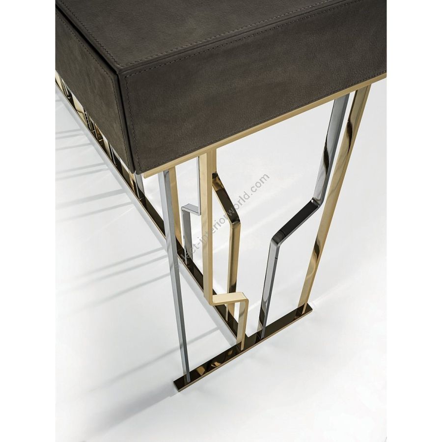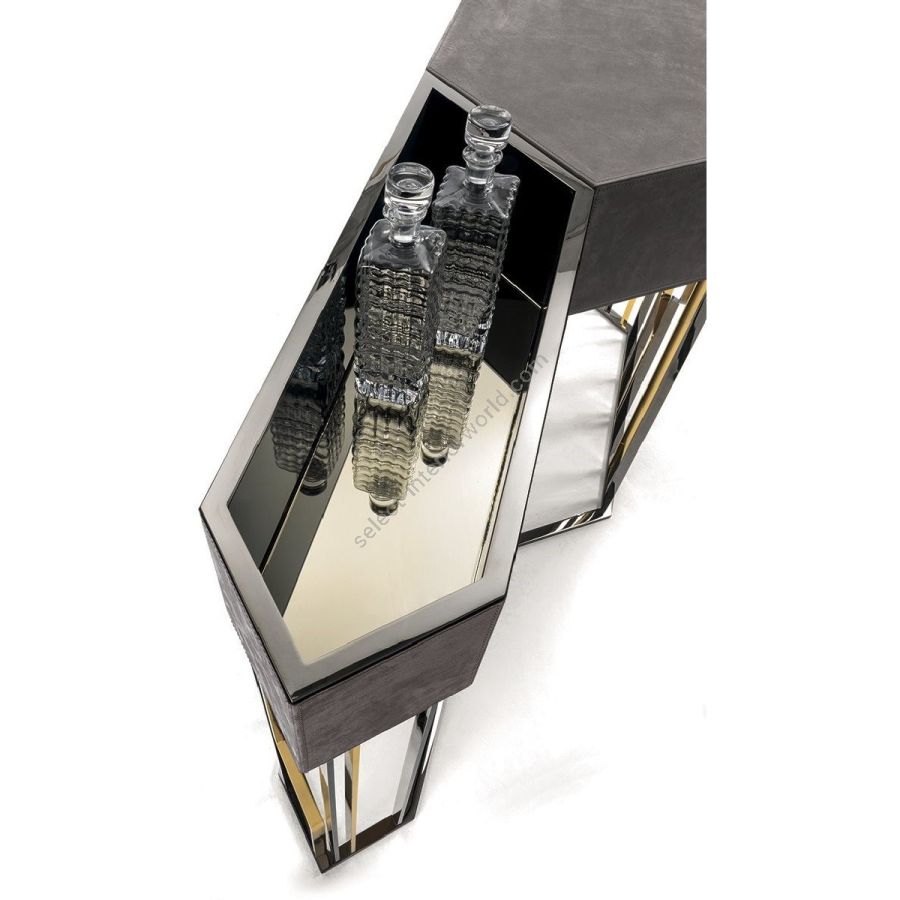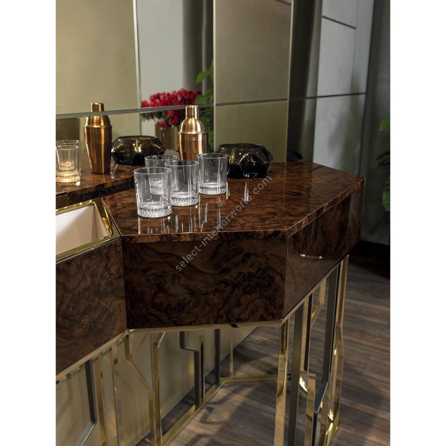A - Version with open bottle holder and wood drawer in the finishes: glossy/matt Maple, glossy/matt heat treated Eucalyptus, glossy/matt ebony, glossy/matt Canaletto walnut, glossy/matt Sycamore frisè, glossy walnut burl wood, upholstered in leathers in the range. The interior of the bottle holder compartment is lacquered in glossy colours from the range with compartment bottom in bronze or smoky mirror.compartment edge in metal in the same finish as the base. Drawer bottom covered in leather in cat. P.3Miami/SoftLeather/Suede. Metal base, available in the following finishes: Satin nickel, bright shaded brown,Black Rose gold, bright light gold, matt Champagne gold, bright chrome, bright black chrome, matt satin bronze, bright pink gold, matt pink gold. two-tone finish, upon request. B - Version with 3 small wood drawers in the finishes: glossy/matt Maple, glossy/matt heat-treatedEucalyptus, glossy/matt ebony, glossy/matt Canaletto walnut, glossy/matt Sycamore frisè, glossy walnut burl wood, upholstered in leathers from the catalogue. Drawer bottoms covered in leather in cat. P.3 Miami/SoftLeather/Suede. Metal base, available in the following finishes: Satin nickel, bright shaded brown, BlackRose gold, bright light gold, matt Champagne gold, bright chrome, bright black chrome, matt satin bronze, bright pink gold, matt pink gold. two-tone finish, upon request.