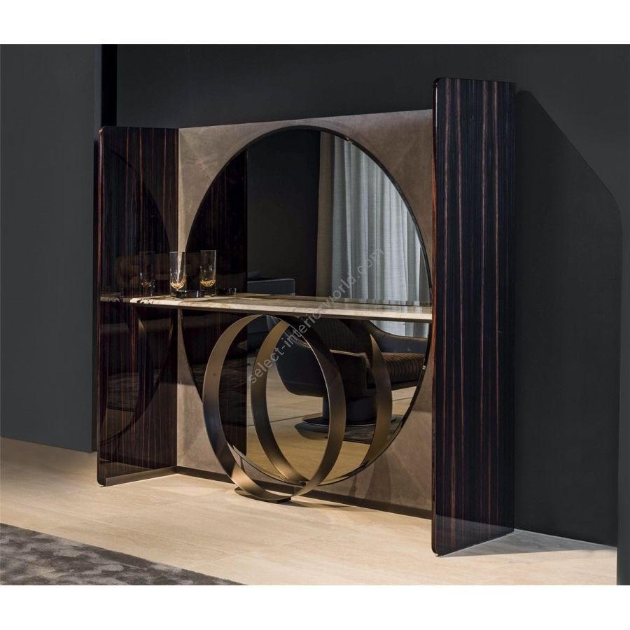 Entrance console with wood sides in: glossy Ebony, glossy Canaletto walnut. Interior lined with leather P.3Cat. Suede with round neutral, bronze or smoky mirror. Shelf in the finishes: bronze or smoky mirror with bevel, Marble th. mm 20 with bevel mm 20: White Carrara marble, Imperial Brown marble, Sahara Noir marble (glossy and matt polyester finish), Dover White marble, Panda White marble, Guatemala Green marble, Corteccia marble, Port Saint Laurent marble, Red Levanto marble, Bardiglio Nuvolato marble,Elegant Brown marble, Shale Rosewood marble, Emperador Dark marble, Silver Wave marble, AgathaBlack marble, Frappuccino marble, Calacatta marble, Fusion Light marble, Patagonia marble, ExplosionBlue marble, Fusion Multicolor marble, Juliet Quartz marble, Calcite Azul marble. Wood like the sides:glossy Ebony, glossy Canaletto walnut. The shelf is supported by a ground metal ring in the finishes: Satin nickel, bright shaded brown, Black Rose gold, bright light gold, matt Champagne gold, bright chrome, bright black chrome, matt satin bronze, bright pink gold, matt pink gold.