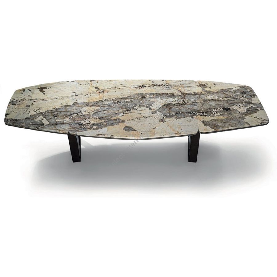 Table consisting of 2 trapezoidal legs and a shaped and sectioned top made of different materials. Machined and laser cut ground metal base in the finishes: Satin nickel, Bright shaded brown, Black Rose gold, bright light gold, matt Champagne gold, bright chrome, bright black chrome, matt satin bronze, bright pink gold, matt pink gold. The leg insert is covered in leather from the catalogue or in wood: glossy/matt Maple, glossy/matt heat-treated Eucalyptus, glossy/matt ebony, Canaletto walnut stained gloss/matt Macadamia, glossy/matt Sycamore frisè. Under-top covered in leather from the catalogue, if desired, matching the leginsert. The top, divided into 2 or 3 parts, is in the finishes: White Carrara marble, Imperial Brown marble,Sahara Noir marble (glossy and matt polyester finish), Dover White marble, Panda White marble, GuatemalaGreen marble, Corteccia marble, Port Saint Laurent marble, Red Levanto marble, Bardiglio Nuvolato marble,Elegant Brown marble, Shale Rosewood marble, Emperador Dark marble, Silver Wave marble, AgathaBlack marble, Frappuccino marble, Calacatta marble, Fusion Light marble, Patagonia marble, ExplosionBlue marble, Fusion Multicolor marble, Juliet Quartz marbl, .or in wood: glossy/matt Maple, glossy/mattheat-treated Eucalyptus, glossy/matt Sycamore frisè, glossy/matt ebony, Canaletto walnut stained gloss/matt Macadamia.