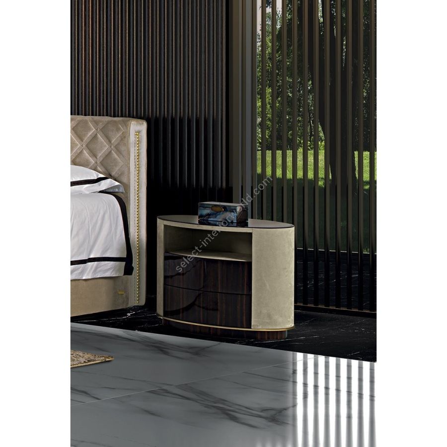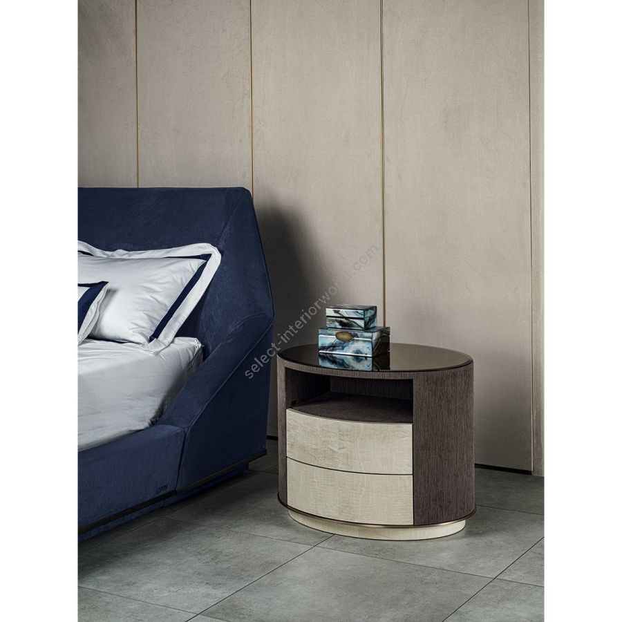 This oval shaped night table is available in a single size: large with two drawers and an open compartment directly under the top. Its refined combination of precious materials and soft geometries allows Elise to be the perfect piece to complete any type of bedroom.