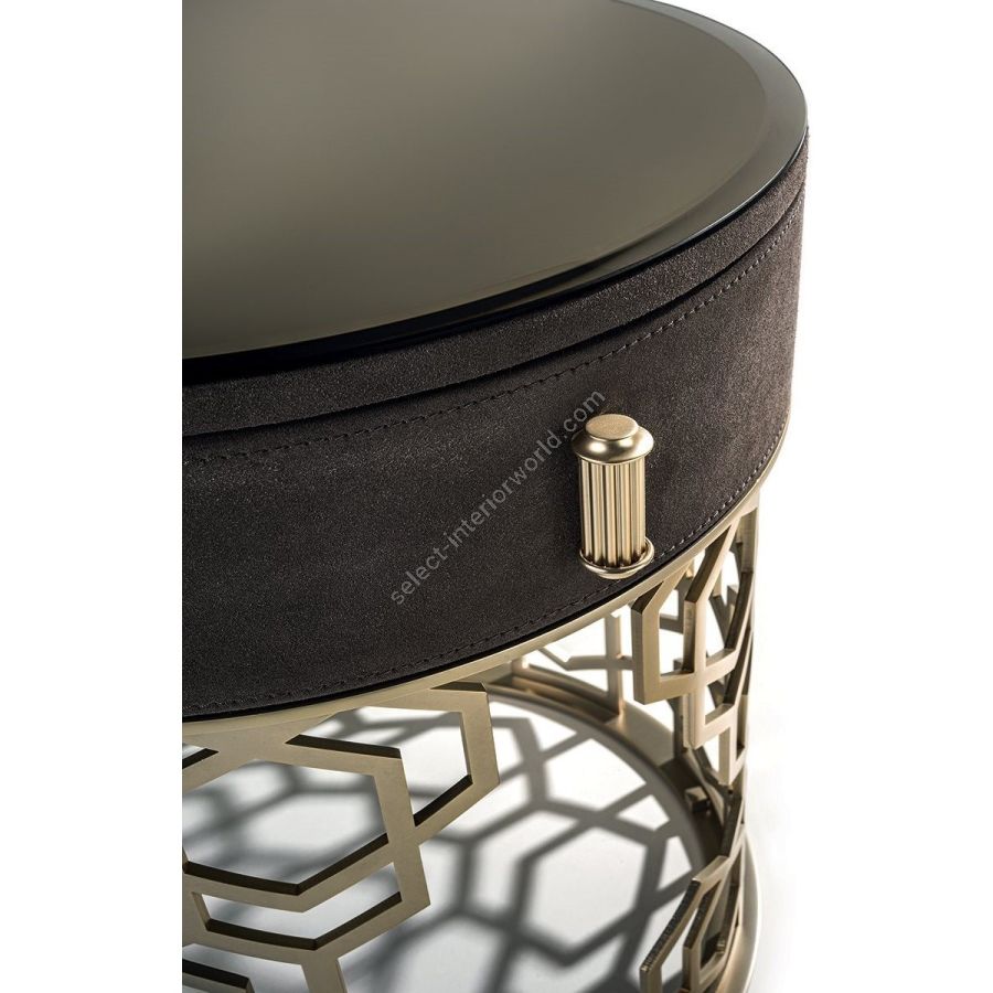 Matched with the Amanda bench, the round Lucy night table belongs to the family of accessories with an unmistakable personality due to the “Sequence” decoration on the base. “Sequence” is a perforated pattern that looks like the result of a manual process but is actually the result of a sophisticated laser cutting process. The “beehive” decoration, by Giuseppe Iasparra, is a style, an authentic iconographic pattern that appears on several pieces in the Loveluxe collection - including tables, furniture and boiserie panels. It is an authentic expression of the Longhi personality.