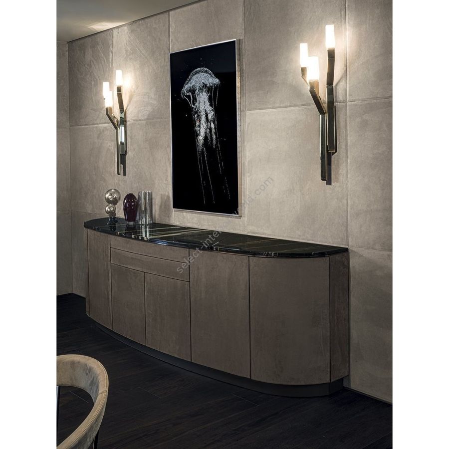 The cabinet’s generous size makes it a versatile and functional piece of furniture. The cabinet features wooden doors and front drawers upholstered in leather with a contoured and trisected top made of multiple materials: a specific characteristic of the Keope collection.