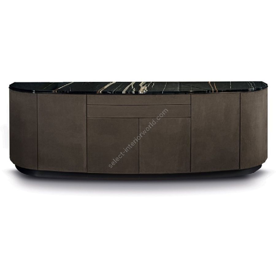 Living room cabinet with doors and drawers having a shaped top in different sections of different materials.- Structure covered in leathers from the catalogue. Push-pull opening and interiors in dark stained zebranowood. The base is painted bronze. The top, divided into 3 parts, is in the finishes: White Carrara marble,Imperial Brown marble, Emperador Dark marble, Guatemala Green marble, Bardiglio Nuvolato marble,Shale Rosewood marble, Silver Wave marble, Agatha Black marble, Calacatta marble, Dover White marble,Red Levanto marble, Elegant Brown marble, Frappuccino marble, Corteccia marble, Panda White marble,Sahara Noir marble (polyester finish), Port Saint Laurent marble, Fusion Light marble, Patagonia marble, ExplosionBlue marble, Fusion Multicolor marble, Juliet Quartz marble, Azul Macauba marble, Portoro marble,or in wood: glossy/matt ebony, Canaletto walnut stained glossy/matt Macadamia, glossy/matt Sycamorefrisè, glossy/matt Maple, glossy/matt heat-treated Eucalyptus. Between the top and the structure of thecabinet is a metal sheet in the finishes: bright shaded brown, Black Rose gold, bright light gold, matt Champagnegold, bright chrome, bright black chrome, matt satin bronze, bright pink gold, matt pink gold.