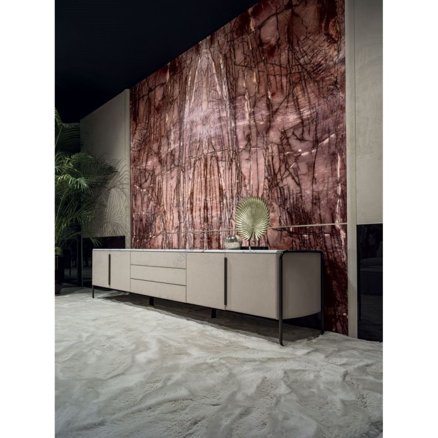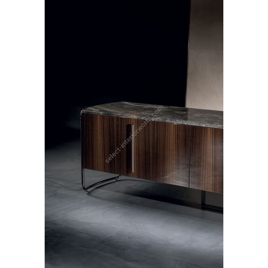 Collection of living room furniture characterized with rounded tubular metal parts, available in two heights and two widths, and comprising a storage container unit with drawers and doors. The wood structure is in glossy/matt Maple, glossy/matt heat-treated Eucalyptus, glossy/matt Ebony, glossy/matt medium Canaletto walnut, glossy/matt Sycamore frisè, or covered in leather from the categories P.3 Tecsuede/P.6 Soffio. The external sides are in tubular metal, slightly curved like a hug, in the finishes: Shaded copper, Bright shaded brown, Black Rose gold, bright light gold, Champagne gold, bright chrome, bright black chrome, matt satined bronze. The tubular metal parts, handles, and supporting base are partially covered in “Renova”, a particular type of recycled leather that is sustainable and anti-bacterial. Available in the colours shown in the catalogue. The top is available in wood 22 mm: glossy/matt Maple, Glossy/matt heat-treated Eucalyptus, glossy/matt Ebony, Glossy/matt medium Canaletto walnut, glossy/matt Sycamore frisè. Or in marble, thickness 20 mm: Silver beola stone, Cipollino marble, Arabescato Orobico marble, Silver Stream marble, White Carrara marble, Imperial Brown marble, Sahara Noir marble (polyester finish), Dover White marble, Guatemala Green marble, Red Levanto marble, Shale Rosewood marble, Emperador Dark marble, Silver Wave marble, Agatha Black marble, Frappuccino marble, Calacatta marble, Patagonia marble, Juliet Quartz marble. A crystal shelf is positioned inside. The cabinet is finished on all sides.