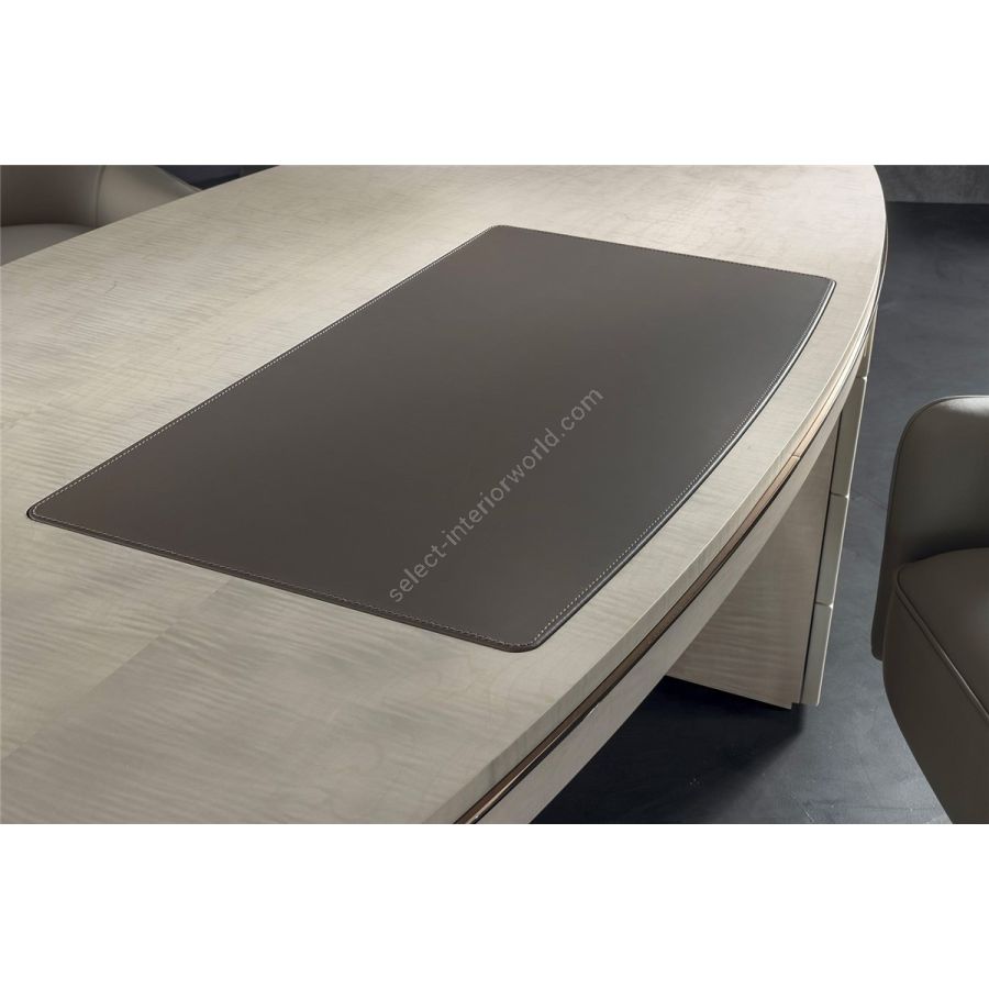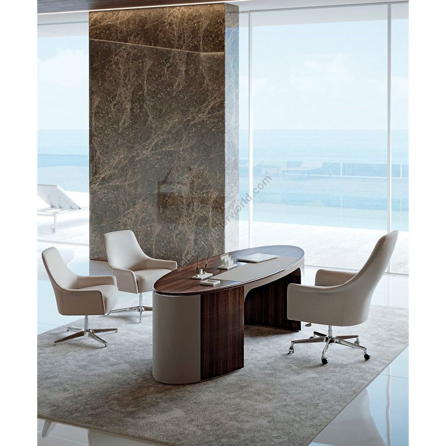 Elliptical desk with a wooden bridge structure in the finishes: Matt eucalyptus, Matt ebony, Matt sycamore frisè. Or covered in coloured leather from the catalogue. The desk has two chests of drawers incorporated into the structure. Each has 4 drawers with fronts in wood or leather. The elliptical top is in wood with the same finish as the structures with leather inserts. Under the top, there is a decorative metal profile in the following finishes: Satined champagne, Bright/satined Burnished, Shaded copper, Bright/satined shaded brown, Bright/satined Black rose, Bright/satined light gold, Bright/satined chrome, Bright/satined black chrome, Matt satined bronze. A cable hole is available on request