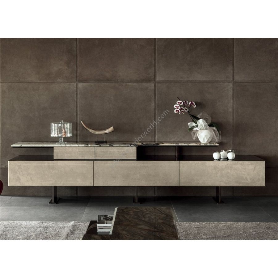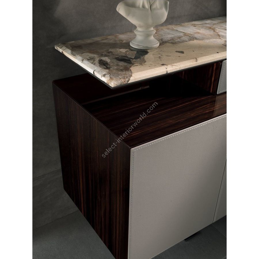 Collection of living room cabinets available in two heights, made up of a storage element with doors anddrawers (the low variant comes with drawers only) and a shelf set on 2 small drawers. Base in aluminium painted bronze. Sides and top in wood: glossy/matt Maple, glossy/matt heat-treated Eucalyptus, glossy/matt Sycamore frisè, glossy/matt Ebony, glossy/matt Canaletto walnut or glossy lacquered wood in coloursfrom the range. Drawer fronts upholstered in leathers from the catalogue. Shelf in the finishes: bronze or smoky mirror. Marble: White Carrara marble, Imperial Brown marble, Portoro marble (divided into 2 pcs.), Sahara Noir marble (polyester finish), Dover White marble, Panda White marble,Guatemala Green marble, Corteccia marble, Port Saint Laurent marble, Red Levanto marble, Bardiglio Nuvolato marble, Elegant Brown marble, Shale Rosewood marble, Emperador Dark marble, Silver Wave marble, Agatha Black marble, Frappuccino marble, Calacatta marble, Fusion Light marble, Patagonia marble,Explosion Blu marble, Fusion Multicolor marble, Juliet quartz marble. Push-pull opening. Interiors are lacquered in matt bronze.