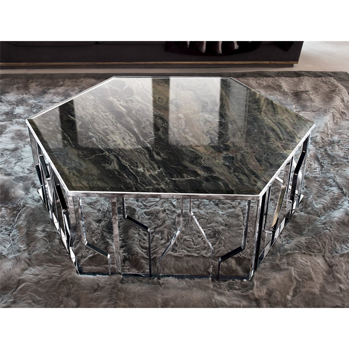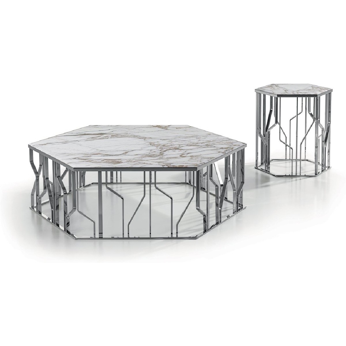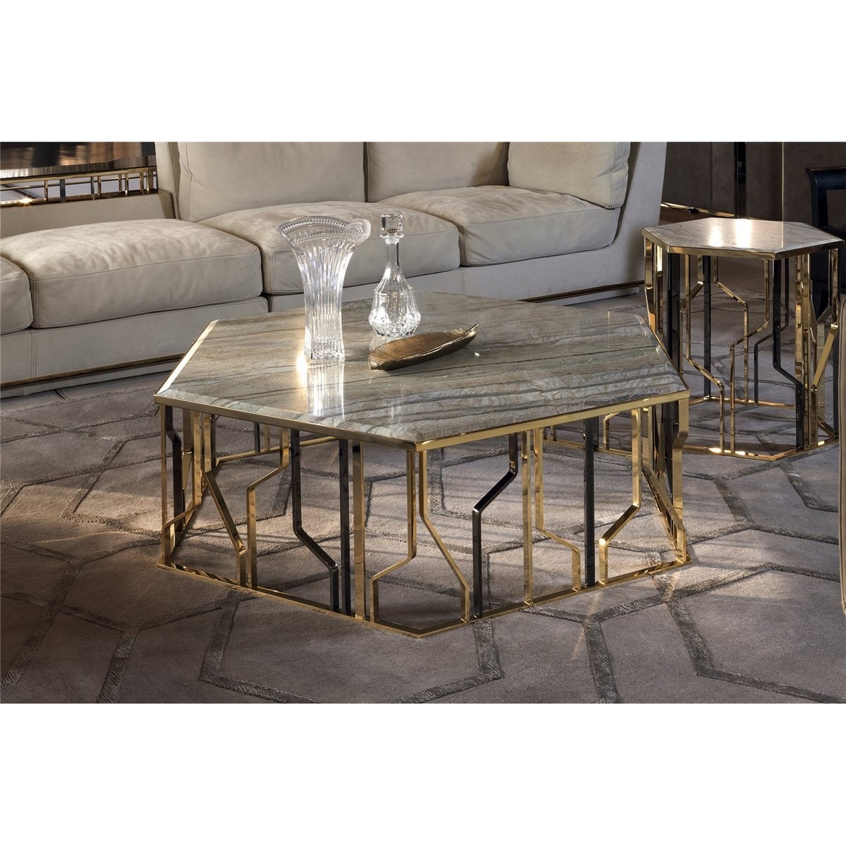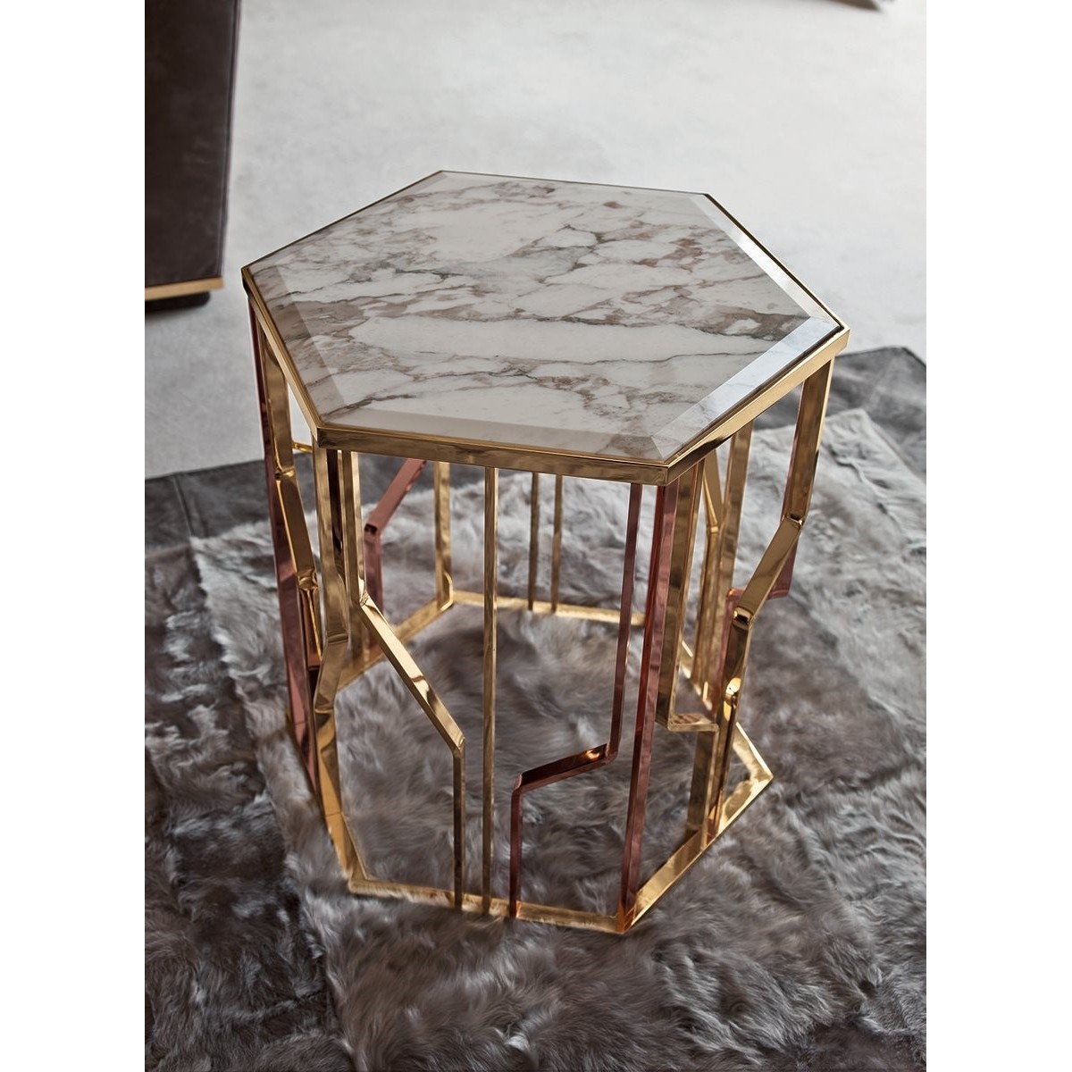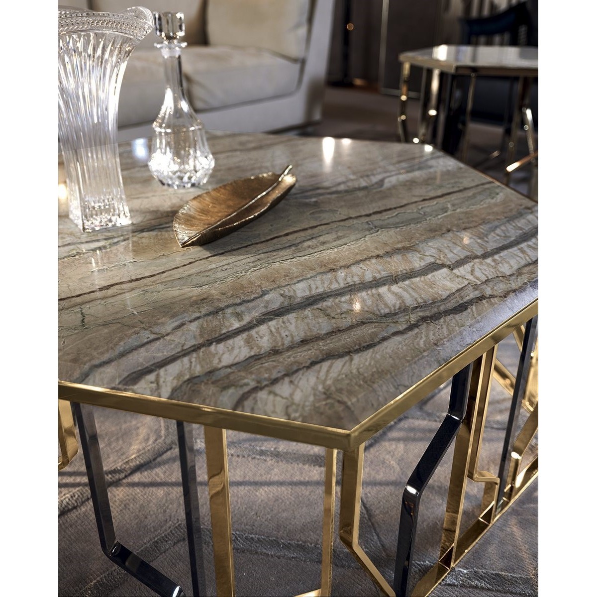 A must from the Loveluxe collection, a well-known series of small tables, consoles and other pieces with the unmistakable style of Alessandro La Spada. To set in the centre of the room or near the sofas, the Ginza tables have hexagonal tops - clear and rigid - supported by a characteristic base decorated with polished or matt finish metal rods that recall stylized “flashes”:the symbol of the entire Ginza series.